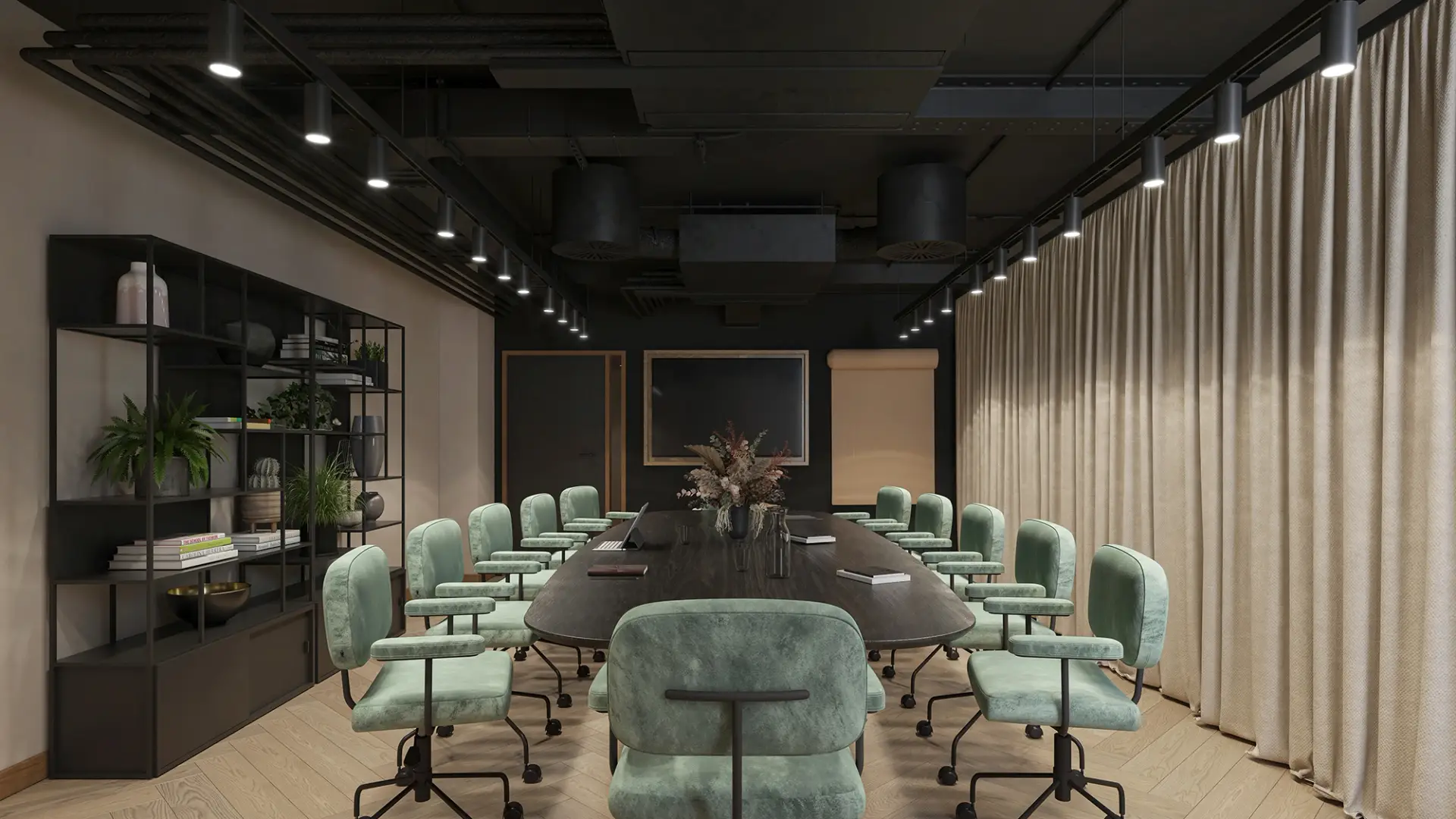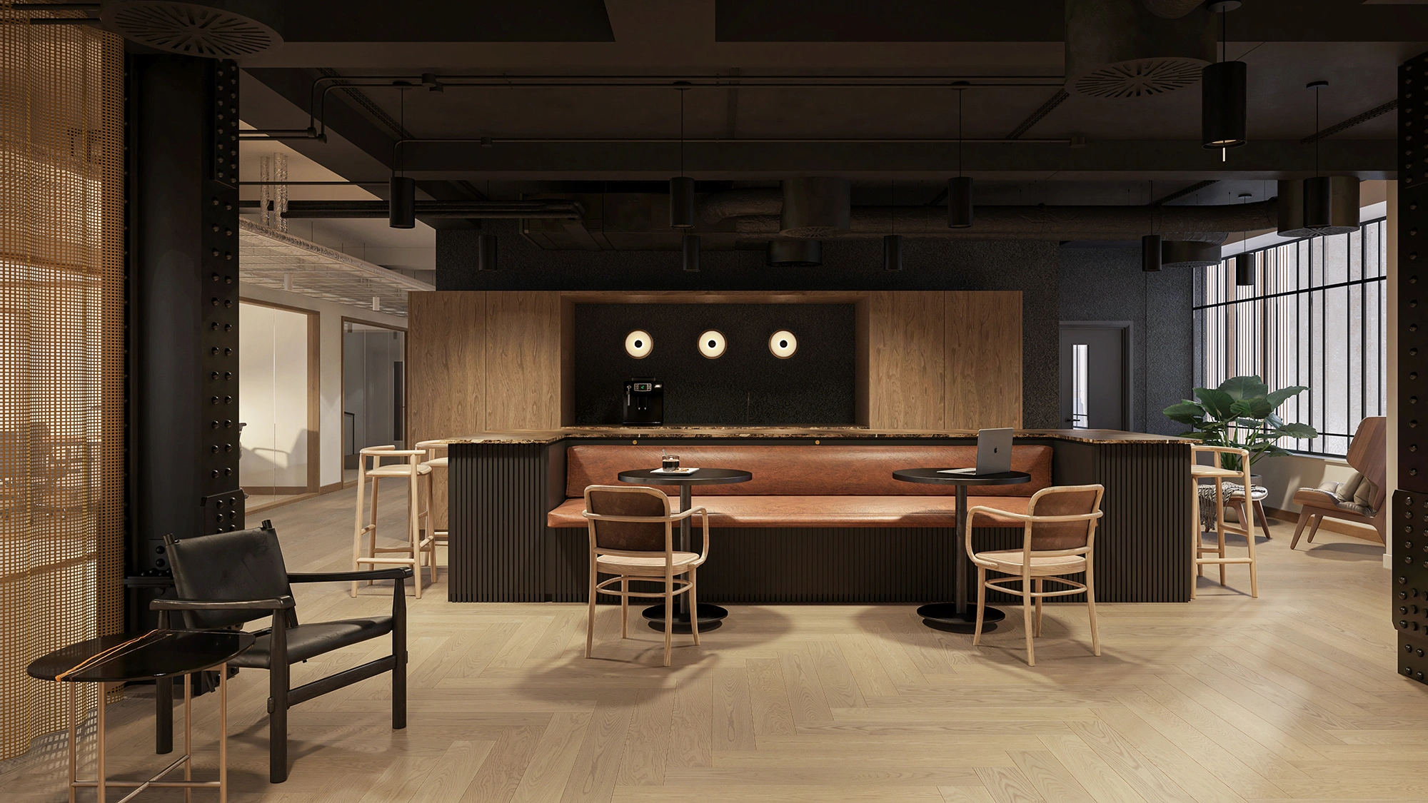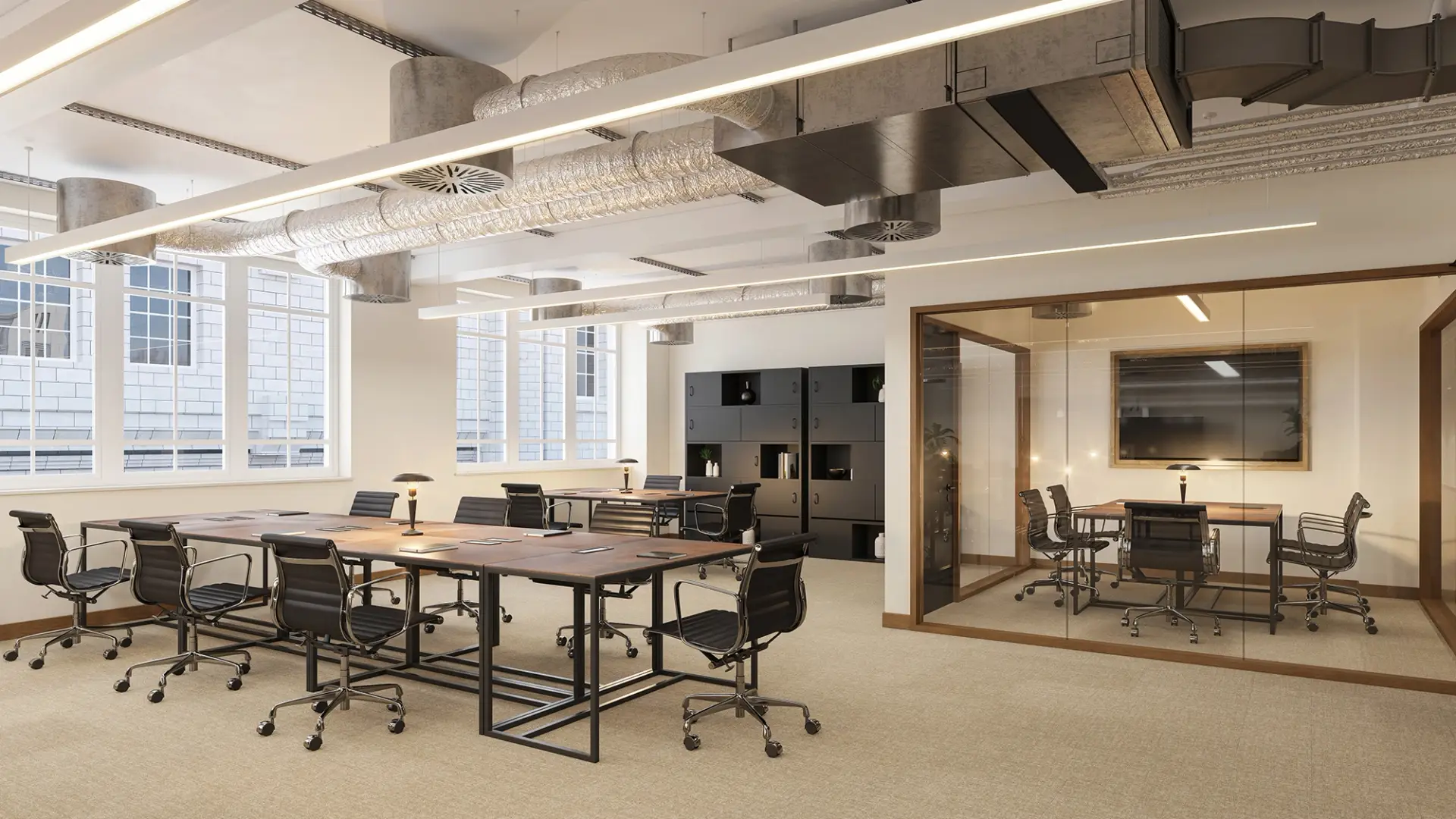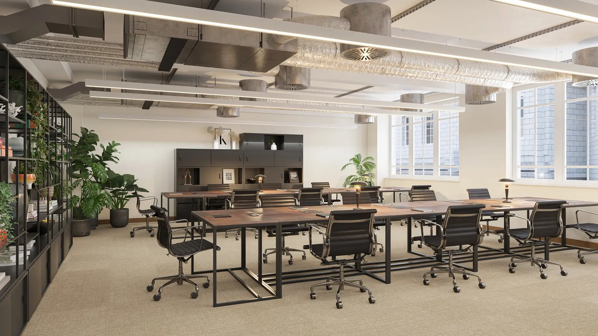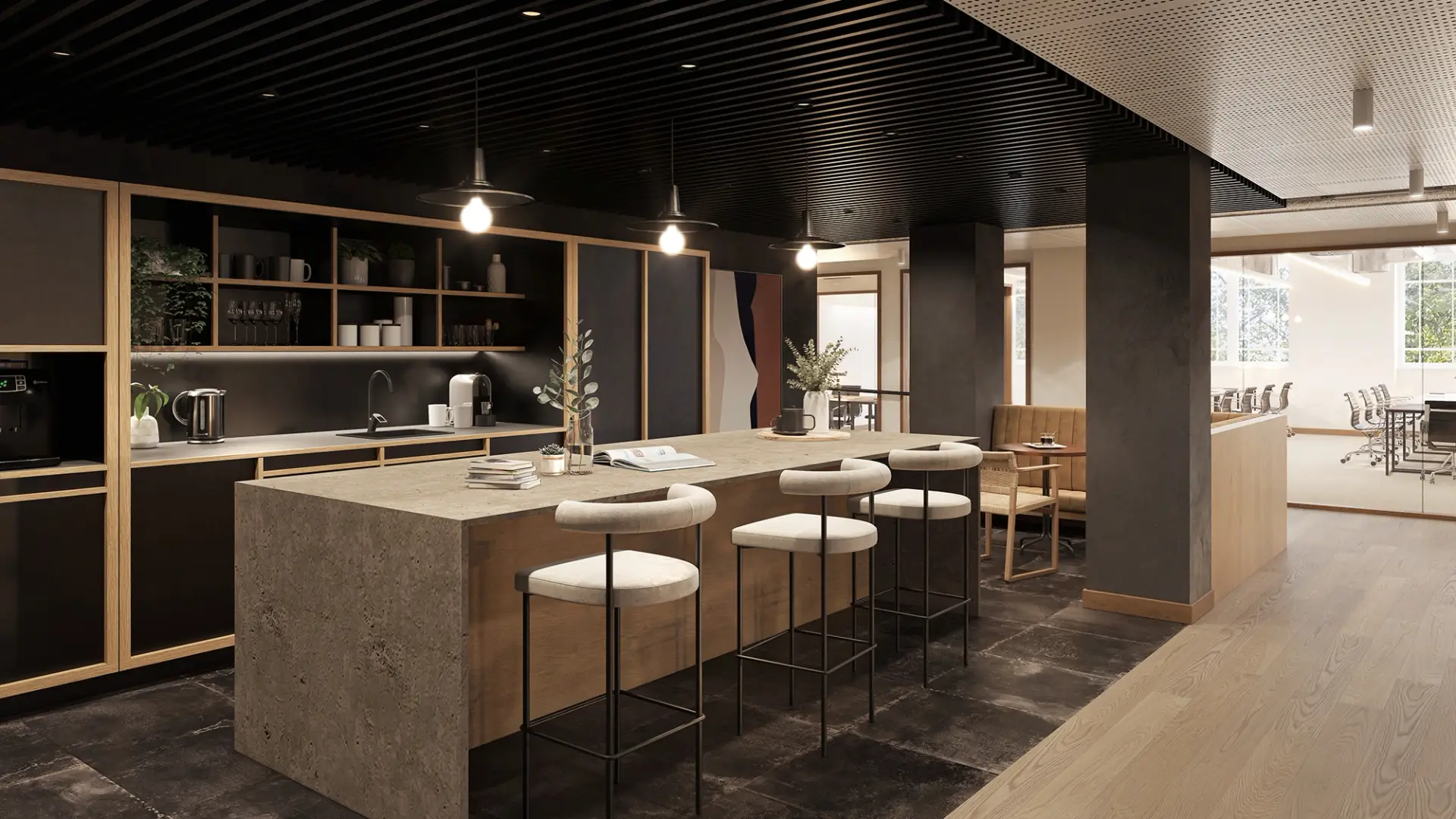We developed a series of high-end visualisations for a contemporary office space designed around strong contrast and refined detailing. The scheme is defined by dark ceiling fixings set against light flooring, creating a visually striking balance that enhances depth and spatial clarity.