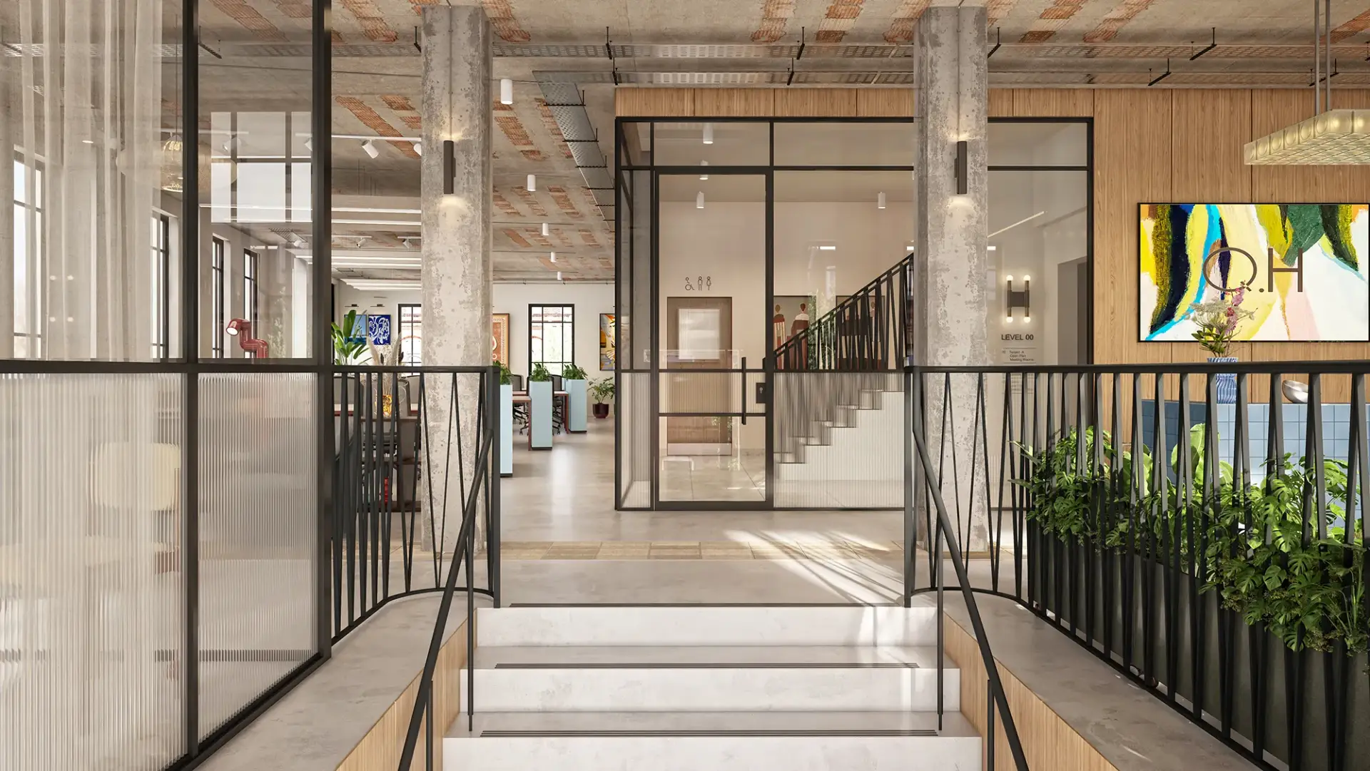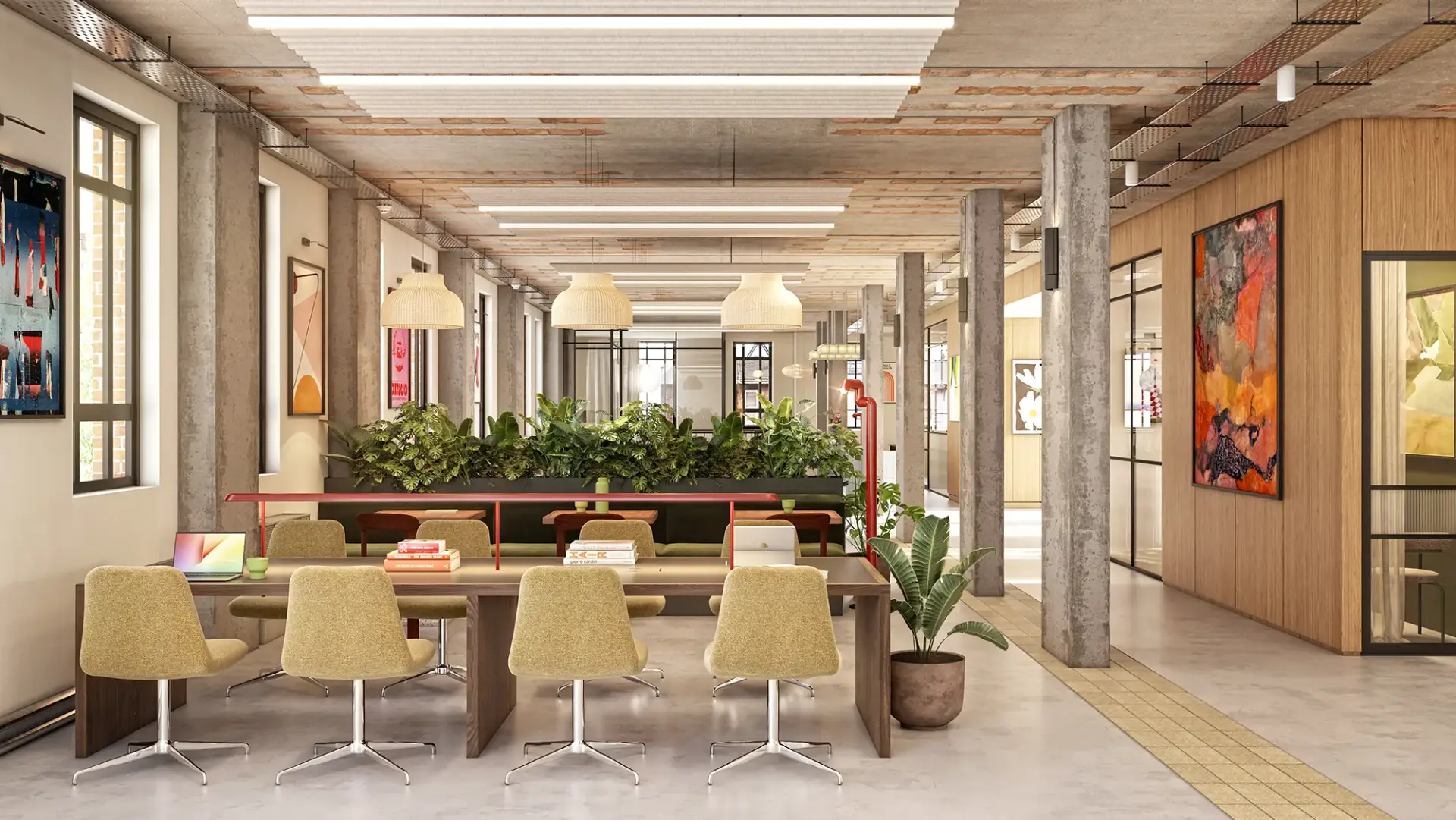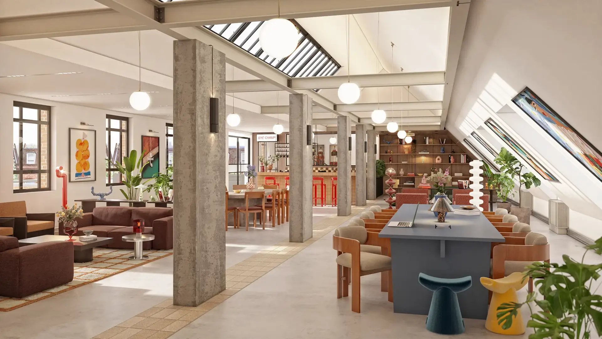 This space captures the essence of modern industrial interior design, where raw architectural features meet refined comfort. Exposed concrete columns, high ceilings, and visible beams create a bold structural foundation, while natural light from skylights and expansive windows enhances every texture and detail.