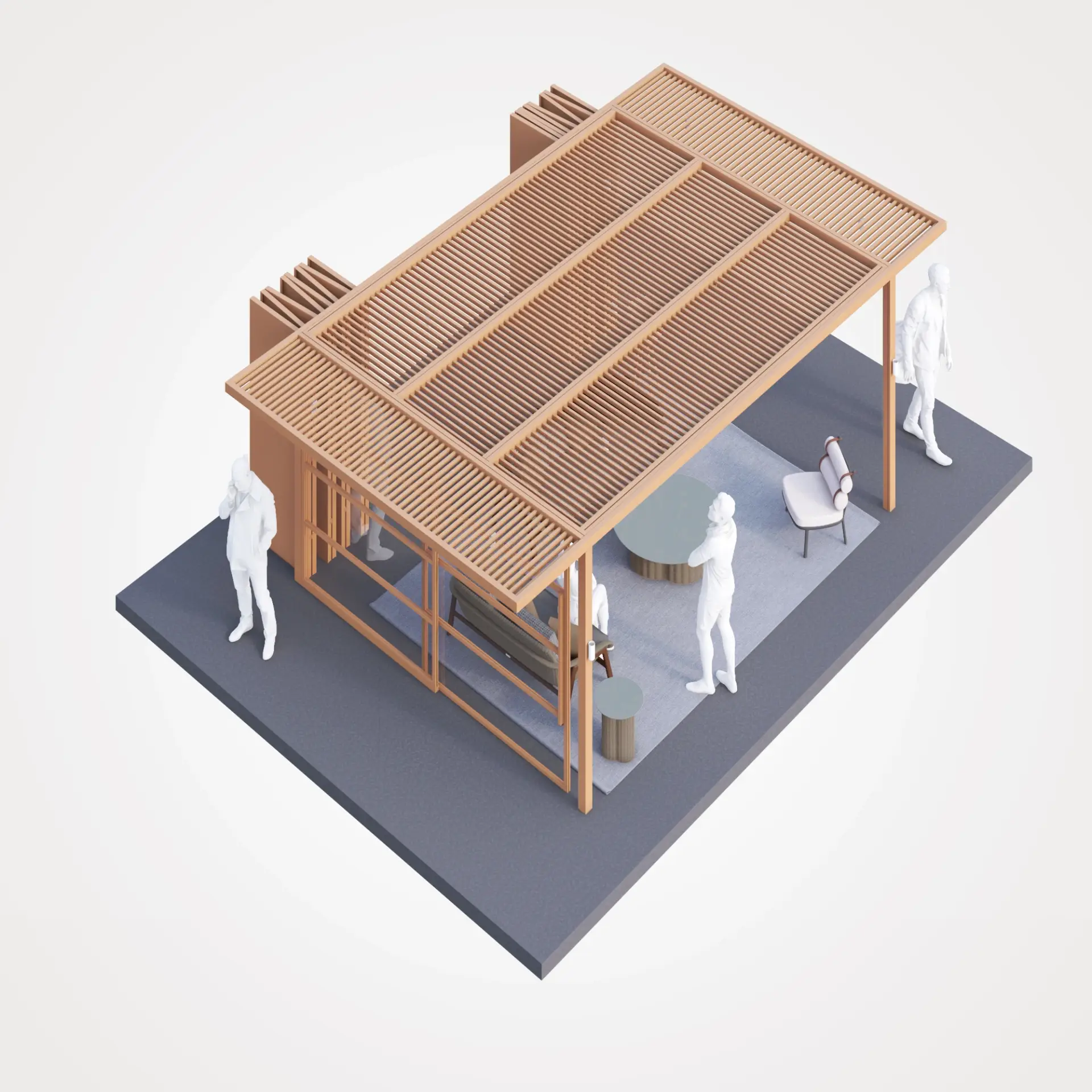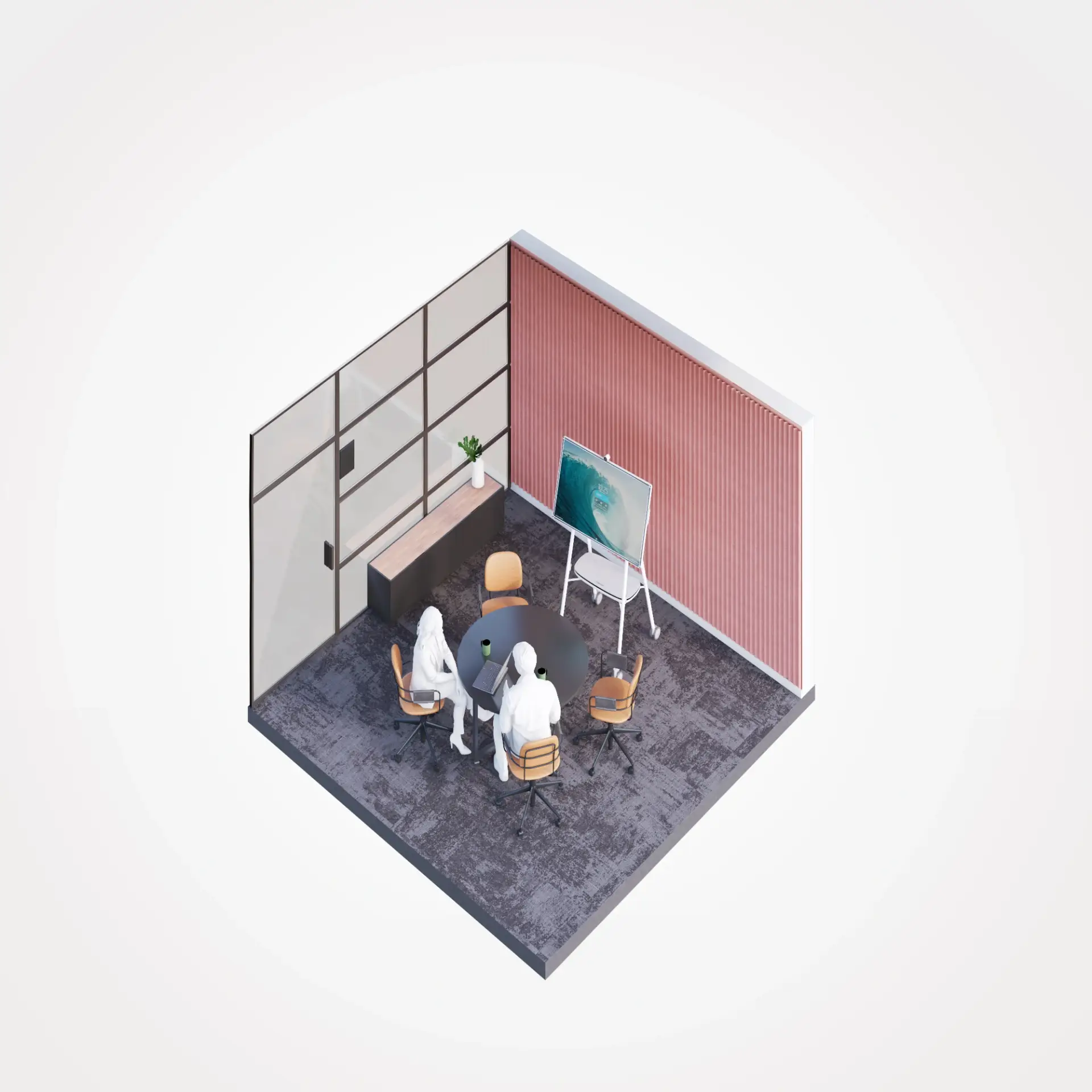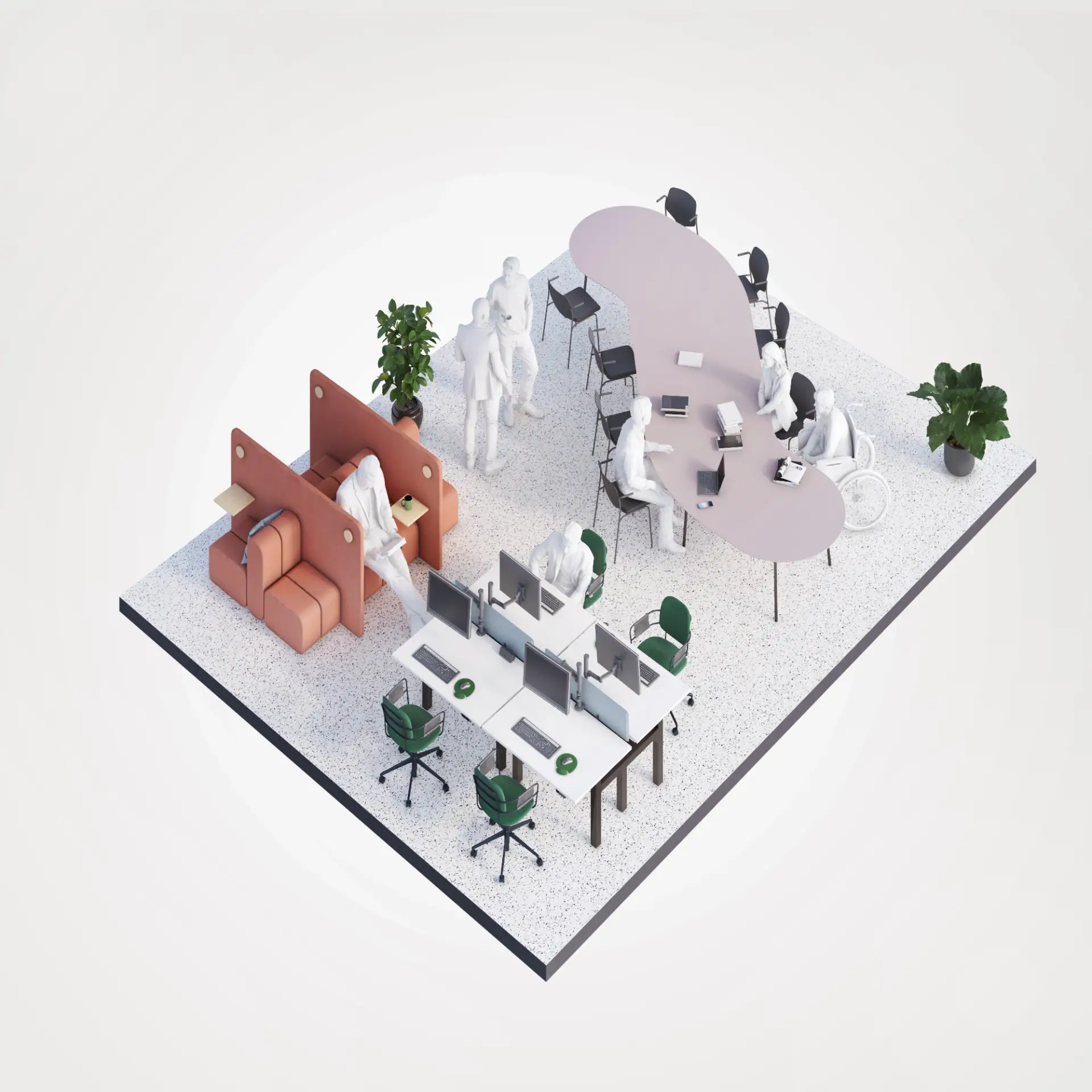 This series presents isometric 3D office visuals on a clean white background, designed to clearly communicate different workplace scenarios. Each composition focuses on a specific activity—whether collaboration, focused work, or informal meetings—using carefully selected office furniture to define purpose and function.