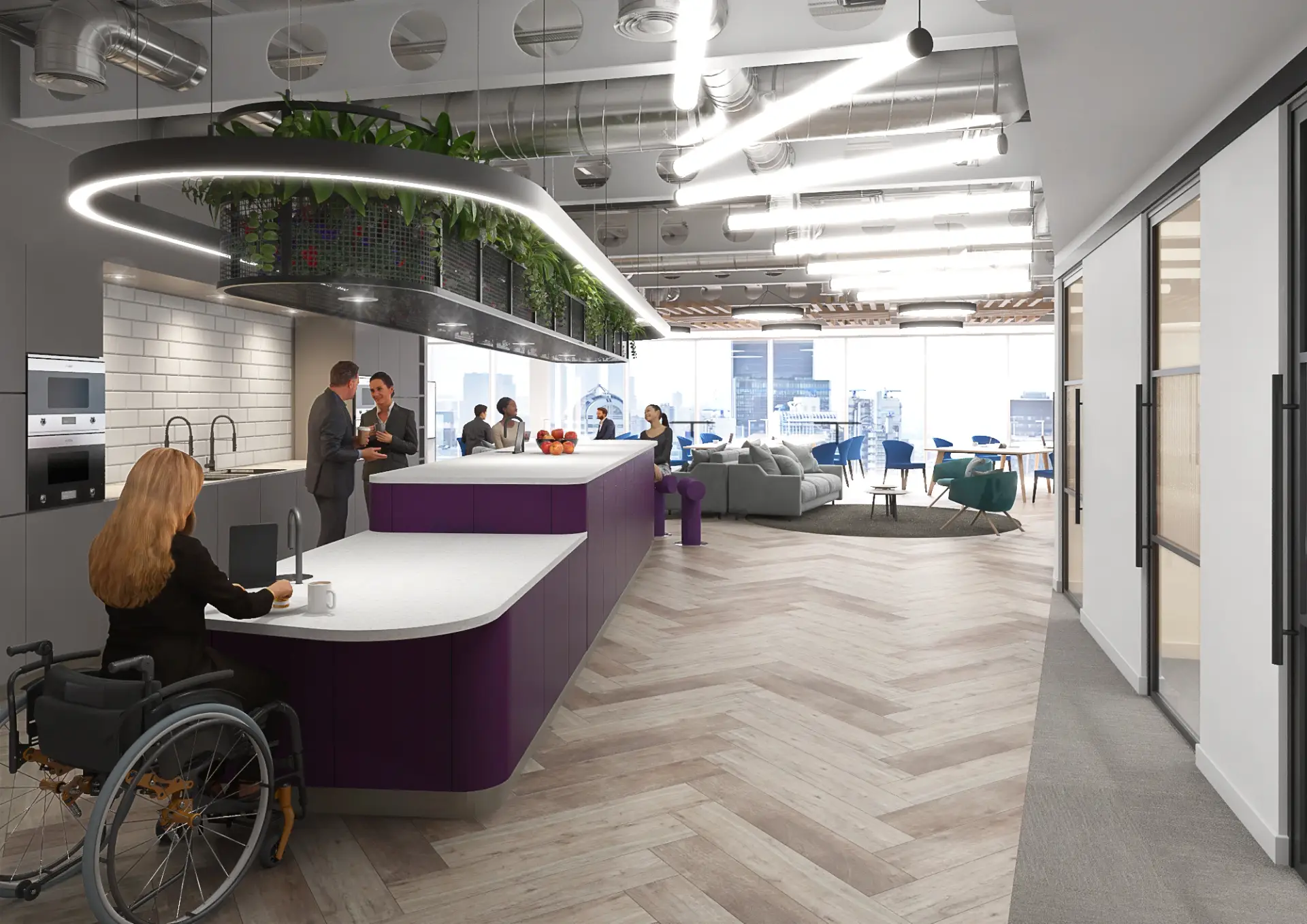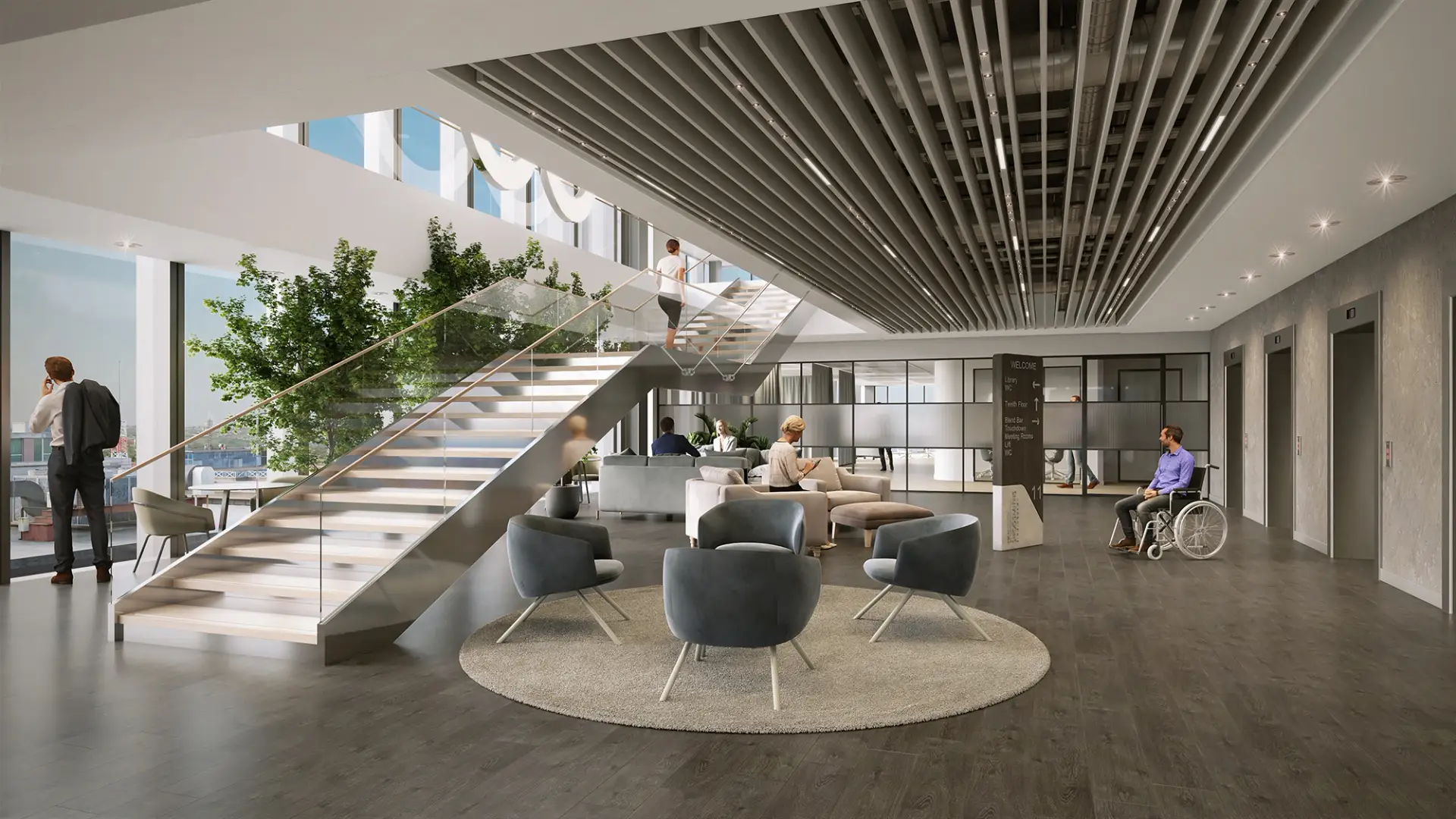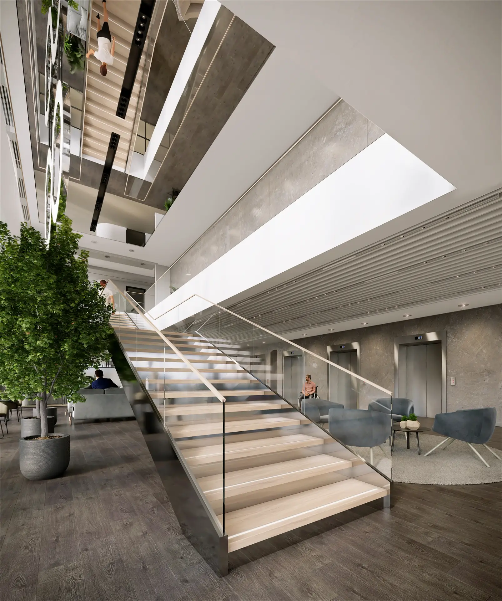 Through photorealistic office CGI and architecture-led interior visualisation, feature stairwells become focal elements within the space. Their sculptural form adds movement and visual interest, reinforcing a sense of clarity, order, and permanence that aligns with the legal sector.