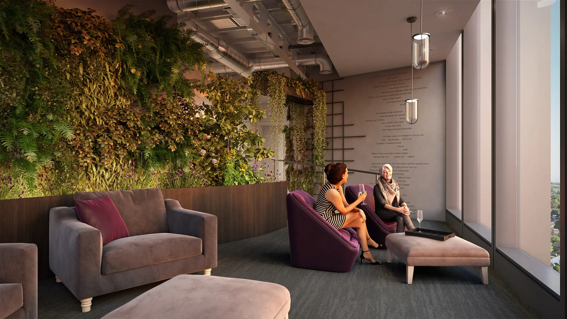 Living walls are integrated throughout the design to introduce a natural contrast, softening the architecture while enhancing wellbeing and creating a more welcoming environment. Dramatic lighting is used to highlight key features and add depth across the space.