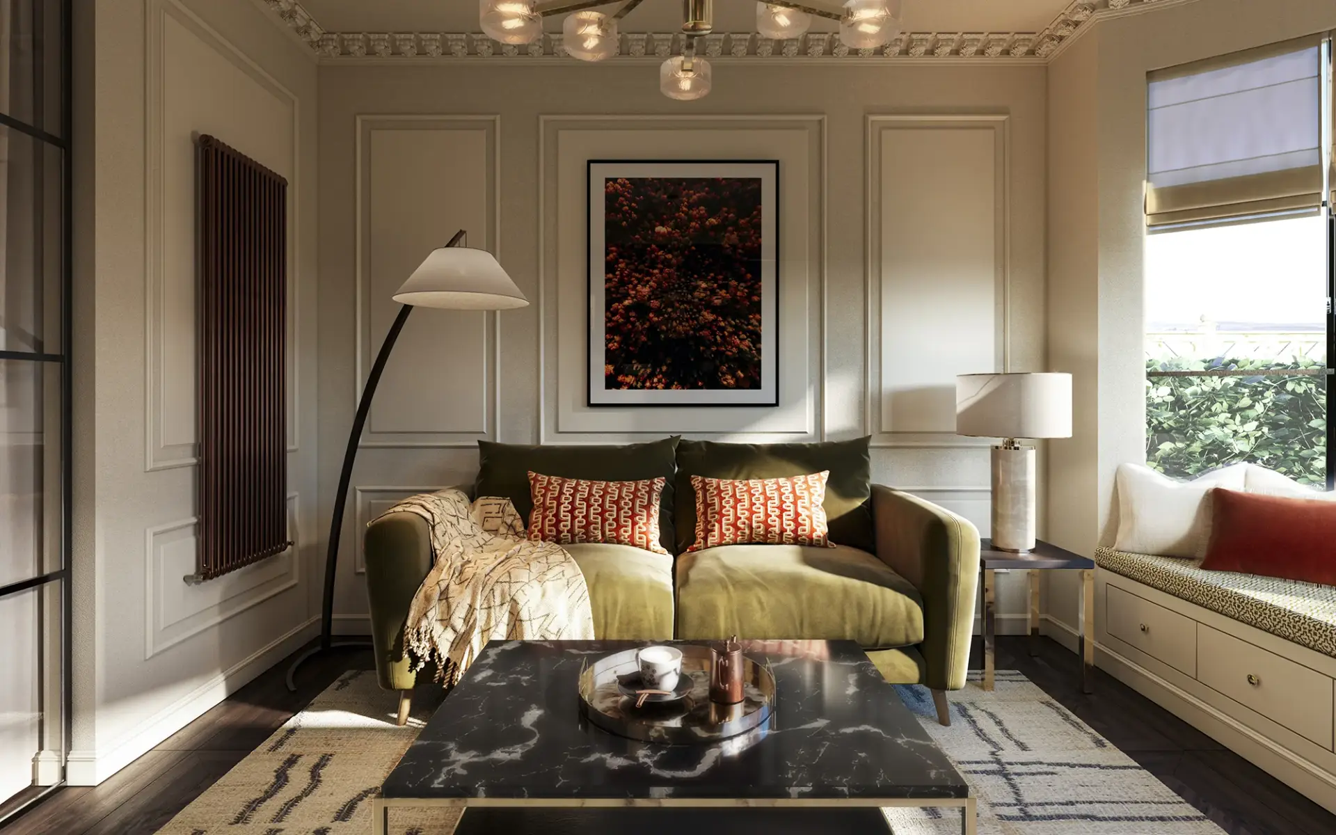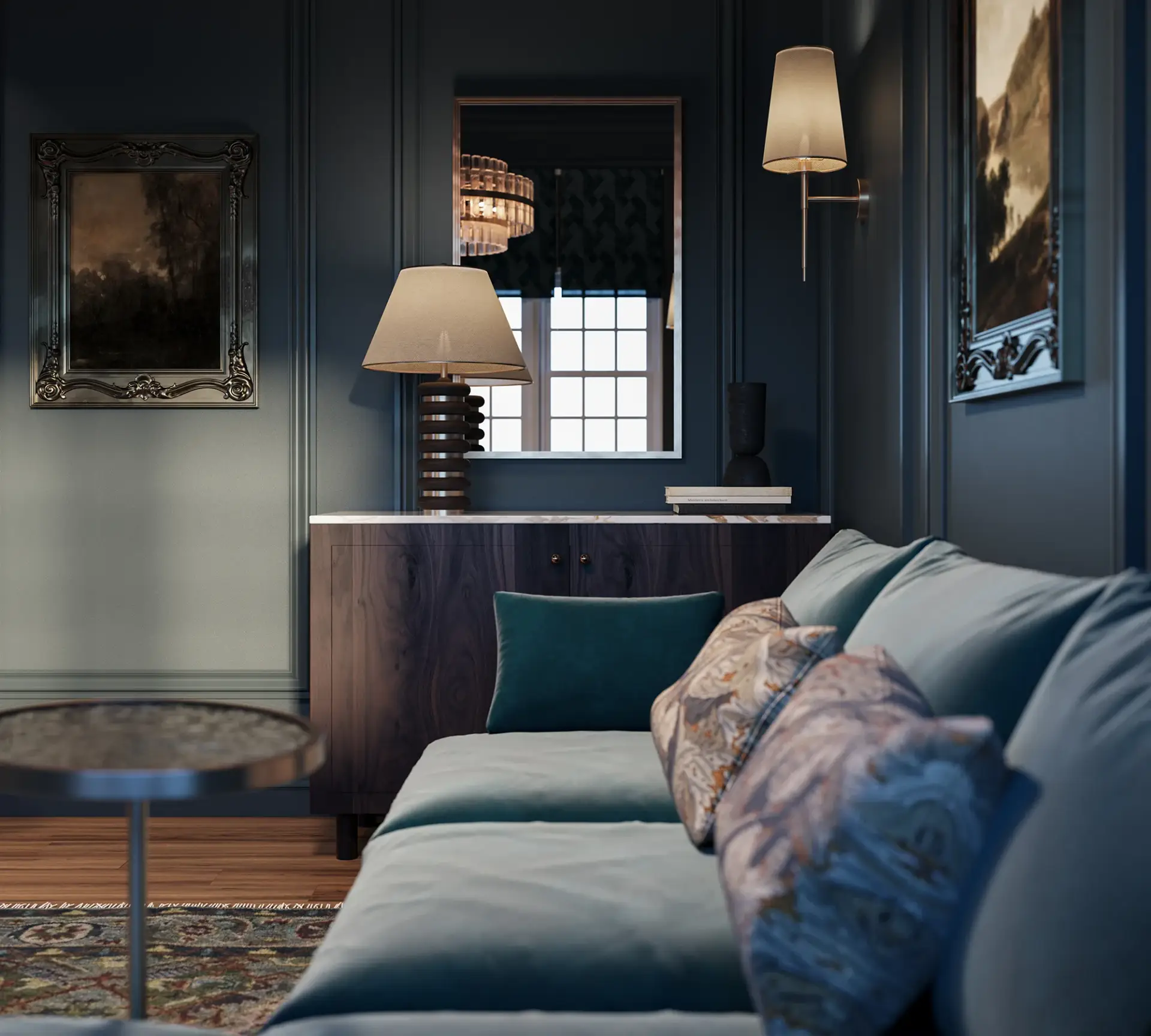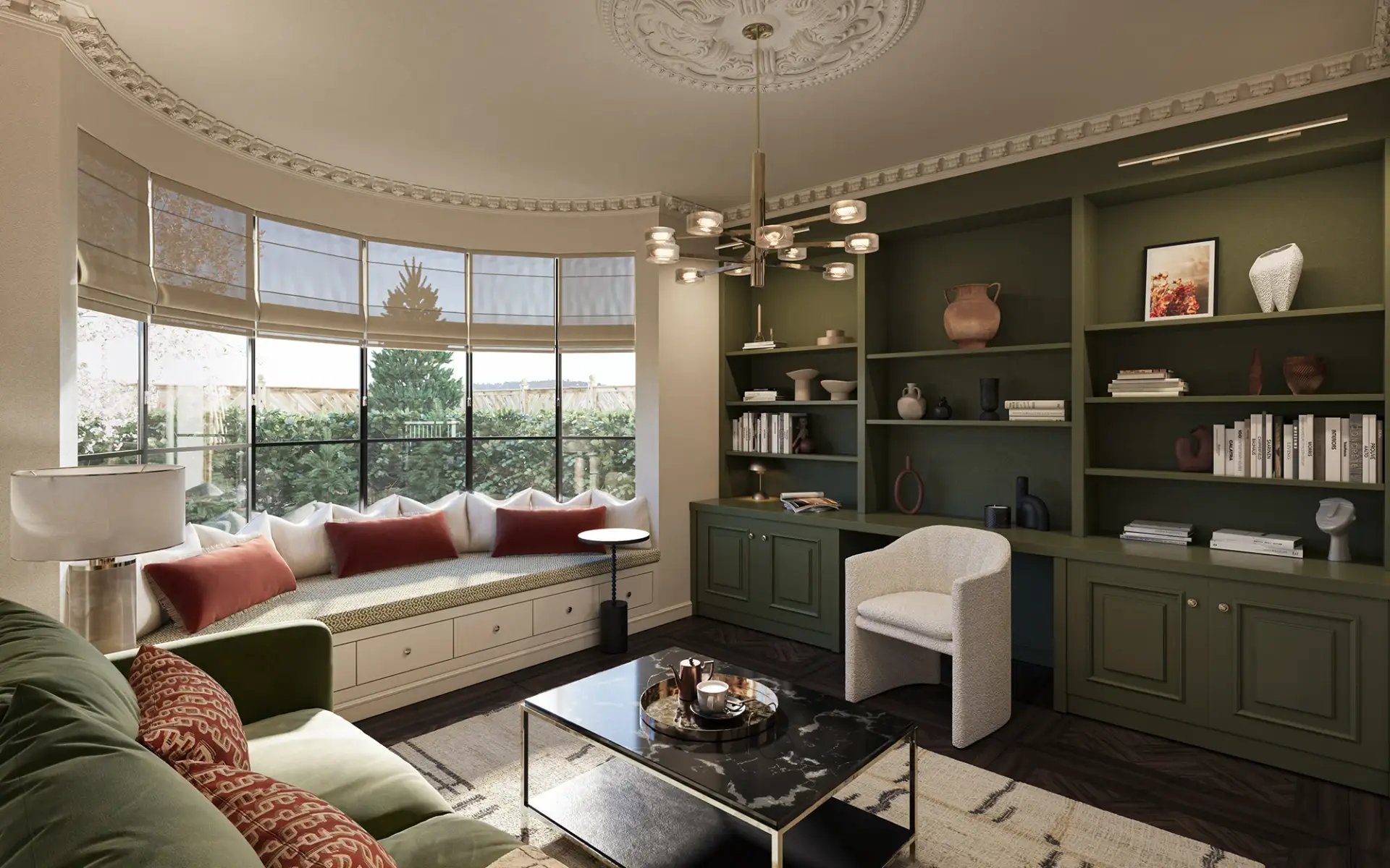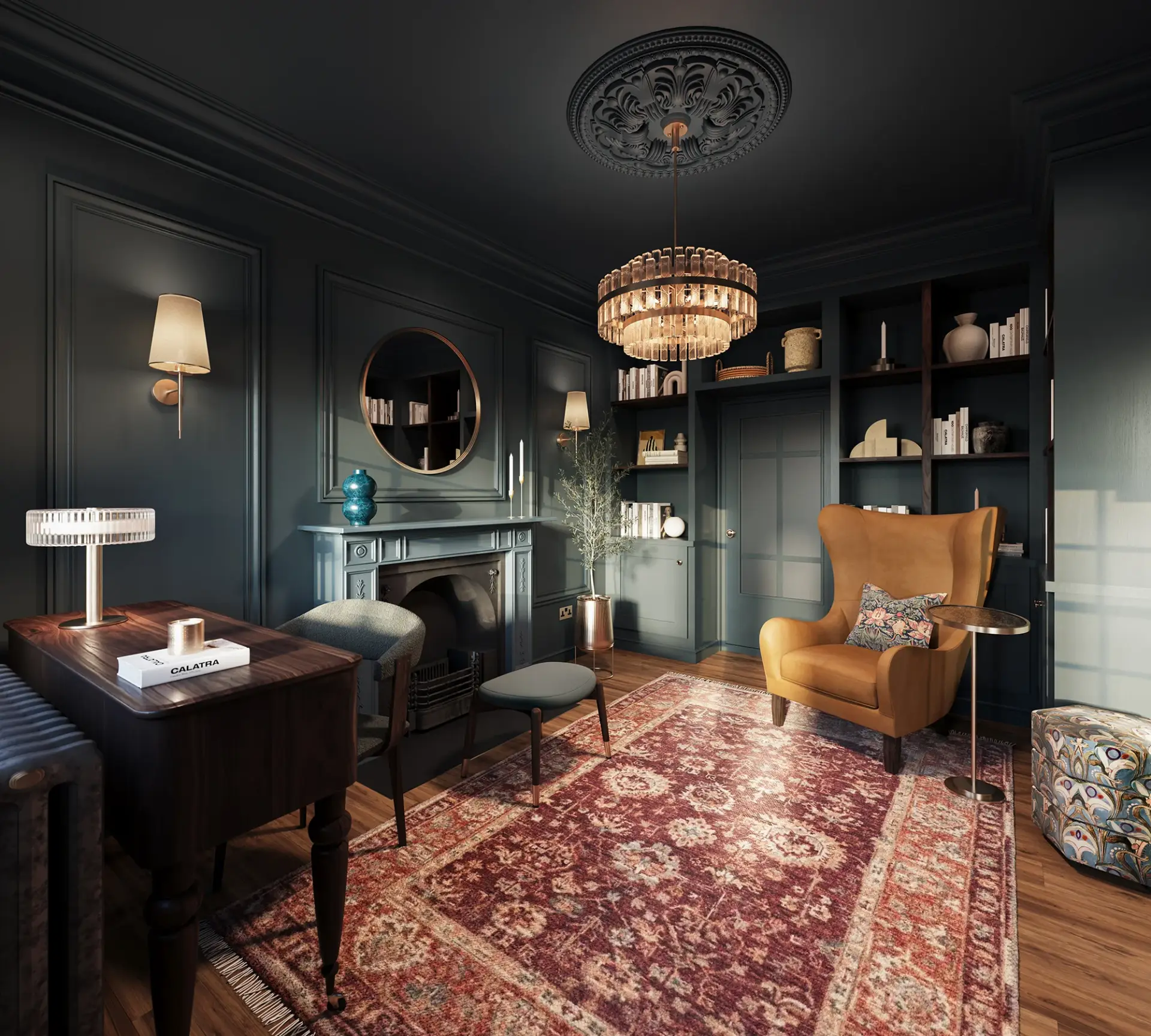 Through photorealistic interior CGI and residential design visualisation, we showcased a depp rich canvas softened by a sophisticated a dramatic palette. Subtle green accents and rich tonal contrasts introduce warmth, while carefully curated materials and finishes create a sense of understated luxury.