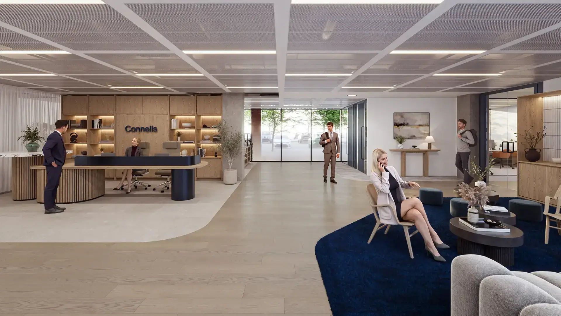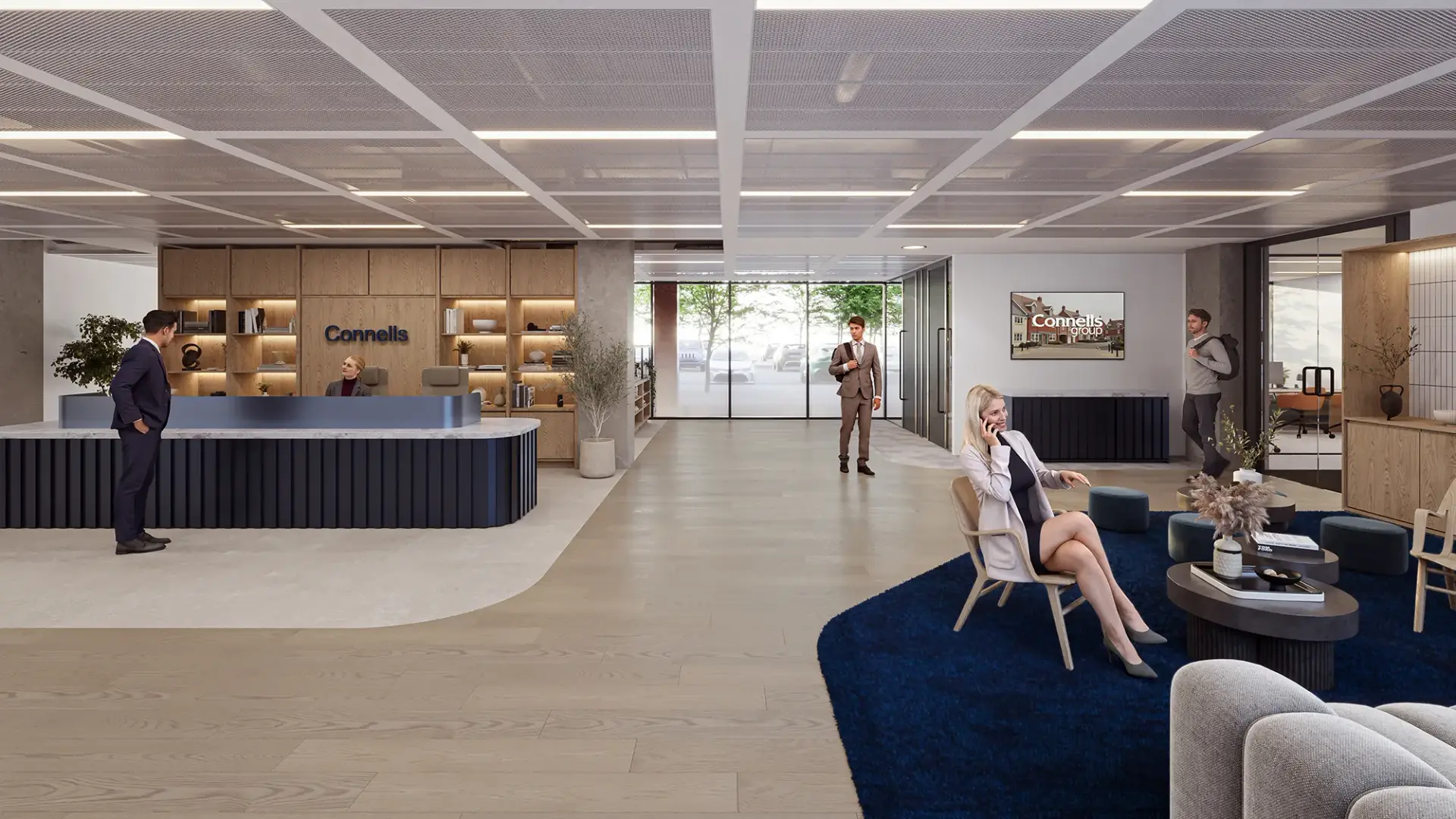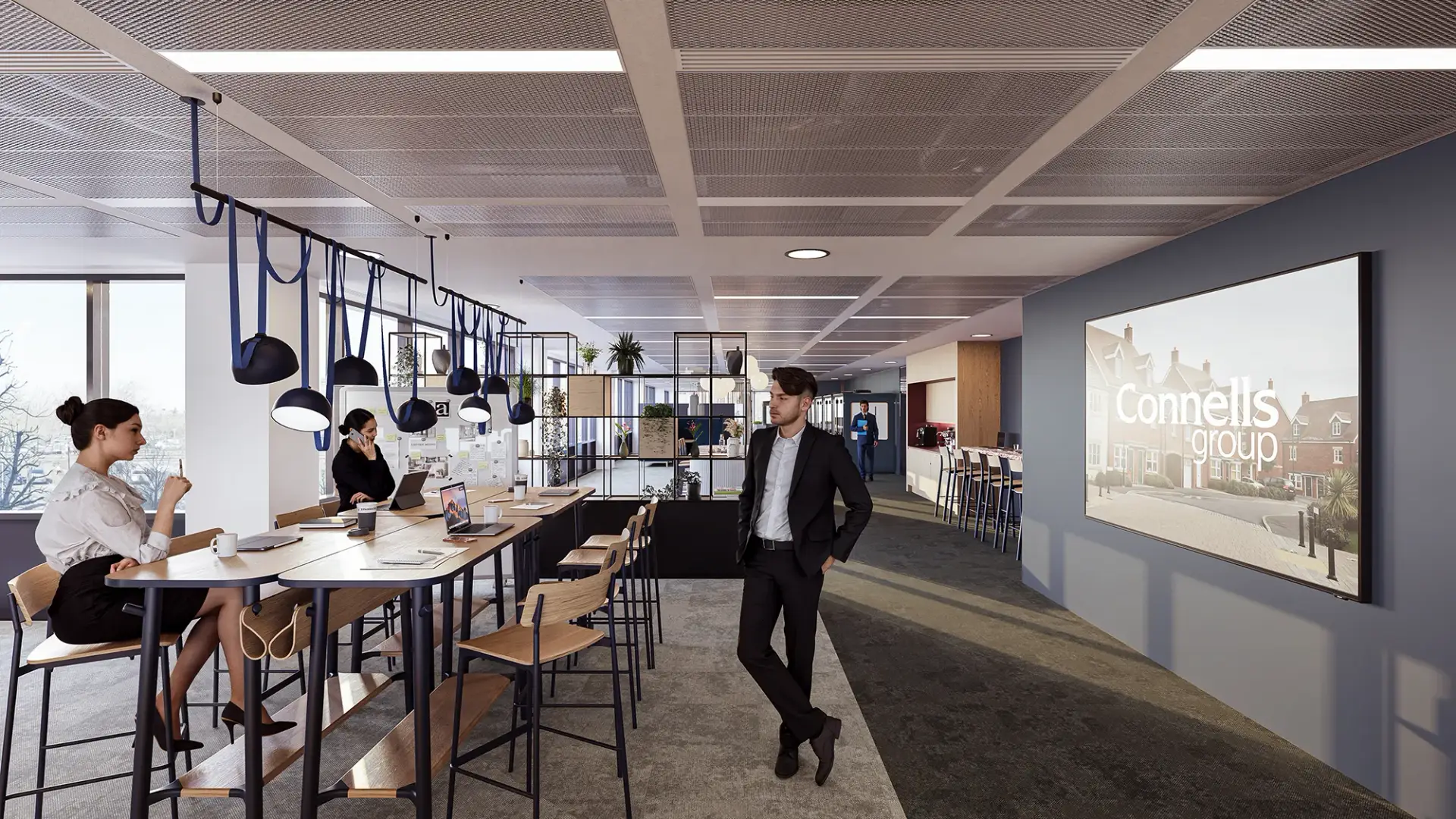 Through photorealistic office CGI and brand-led workplace visualisation, fresh blue accents are layered throughout the interiors, balanced by light wood finishes that introduce warmth and texture. This combination creates a clean, uplifting environment that feels both contemporary and highly approachable.