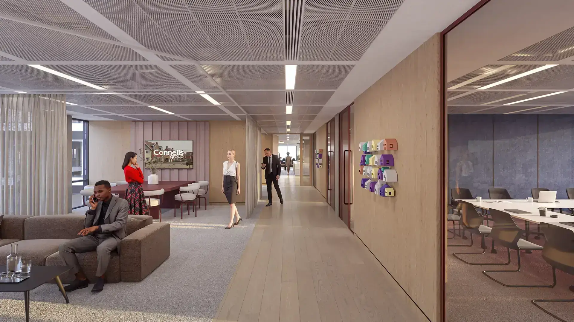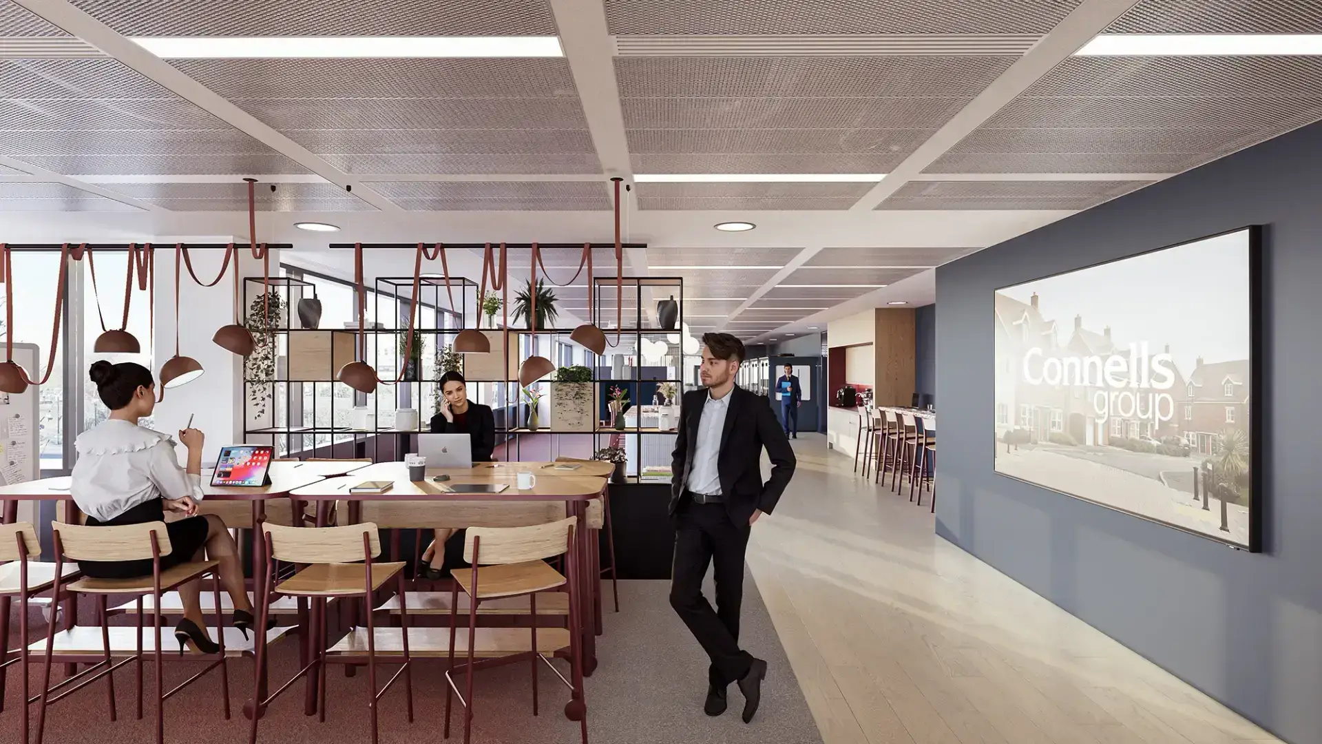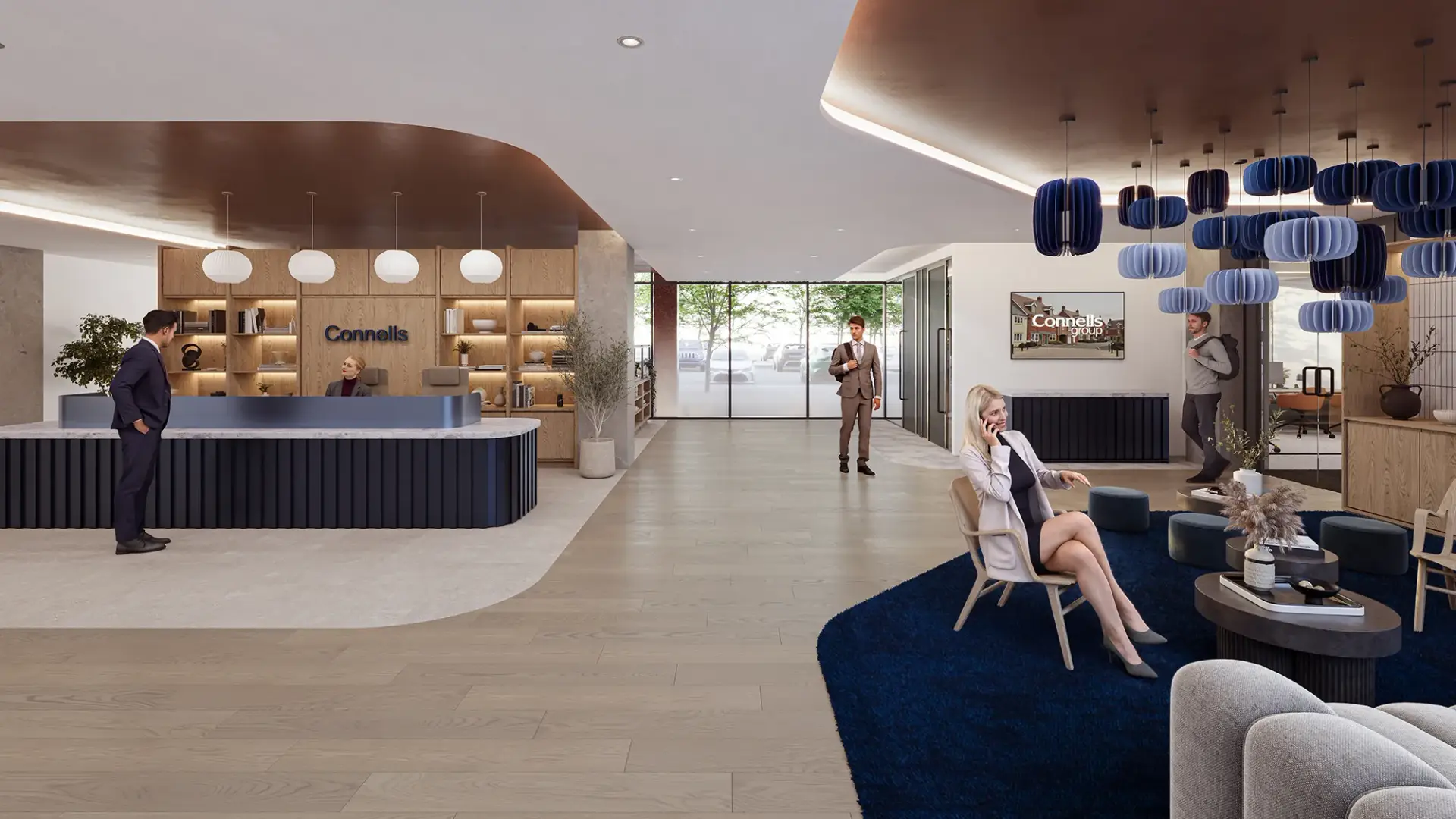 Through photorealistic office CGI and brand-led workplace visualisation, fresh blue accents are layered throughout the interiors, balanced by light wood finishes that introduce warmth and texture. This combination creates a clean, uplifting environment that feels both contemporary and highly approachable.