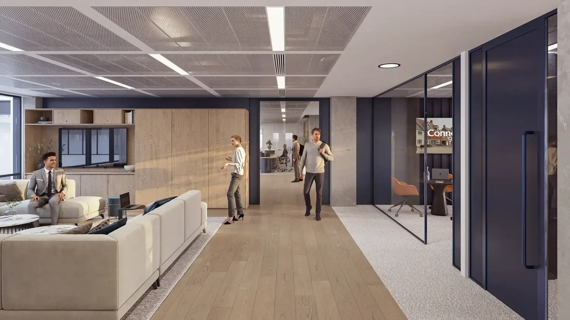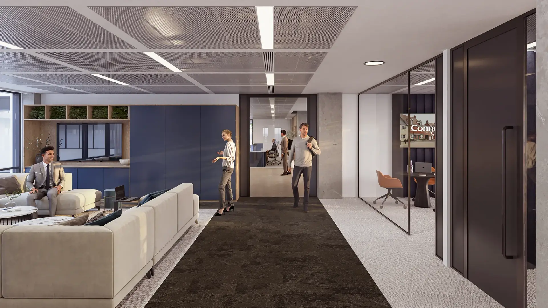We developed a series of high-end visualisations for a British property services company, focused on delivering a modern office design that feels professional, welcoming, and future-facing. The scheme blends crisp spatial planning with a carefully curated palette that reflects trust, clarity, and confidence.