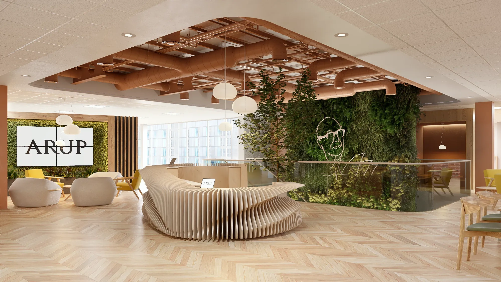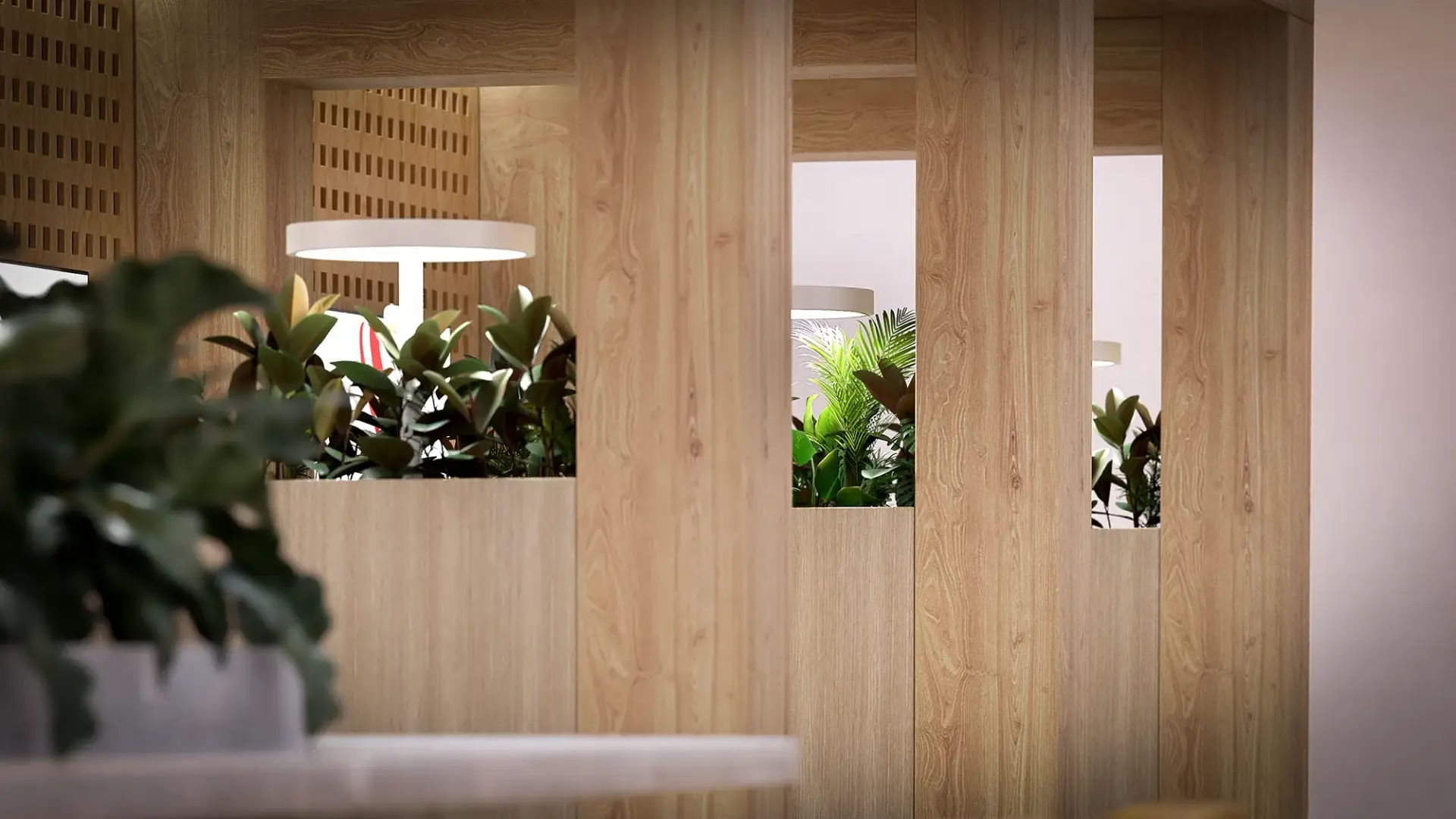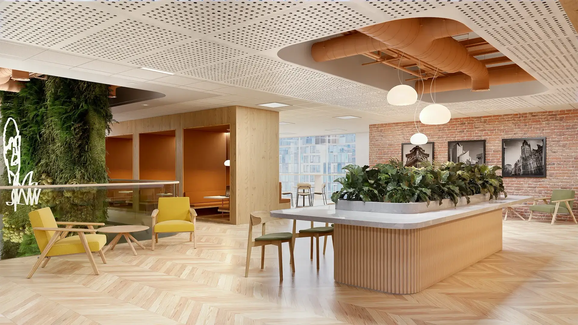 Experience a contemporary Sleek Office Visualisation for an infrastructure workspace where natural wood finishes, bright daylight, and integrated greenery combine with expressive services to create a balanced, modern, and highly functional office environment.