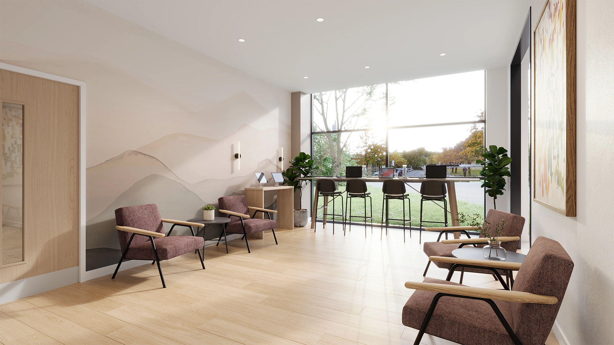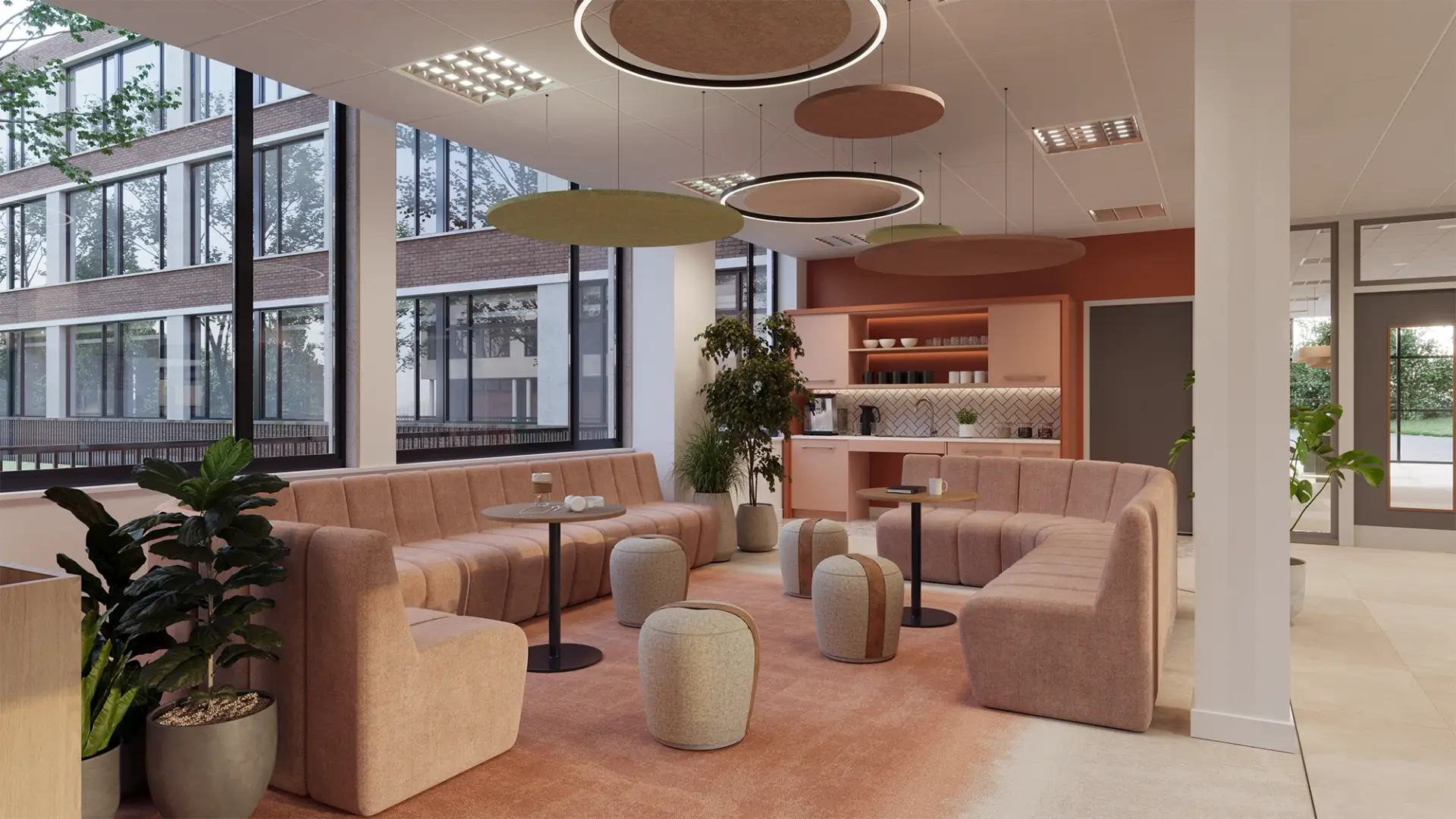 Natural daylight plays a central role in shaping the space, creating an airy and uplifting environment that supports concentration and wellbeing. The light, neutral base palette allows colour accents to stand out without overwhelming the design.