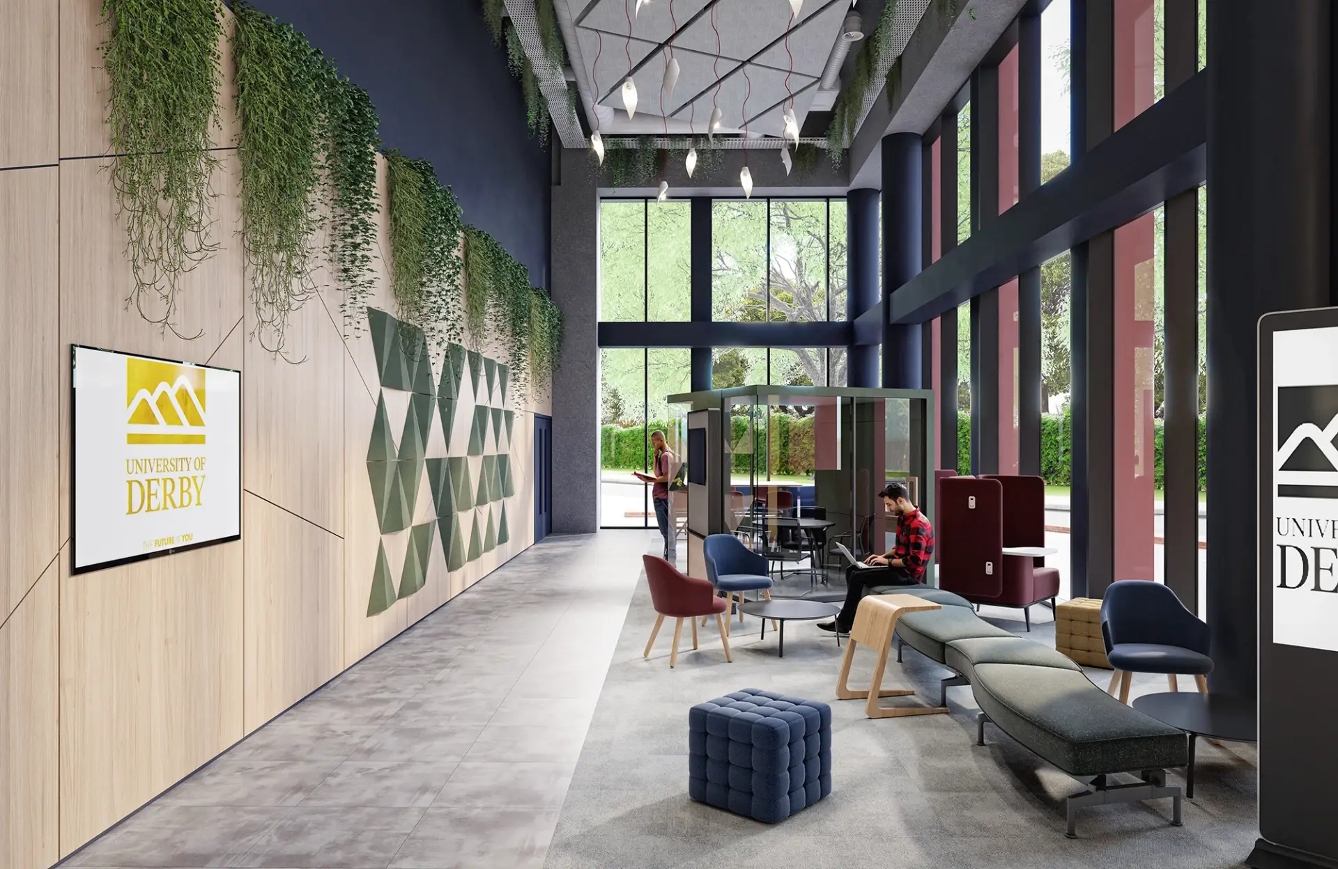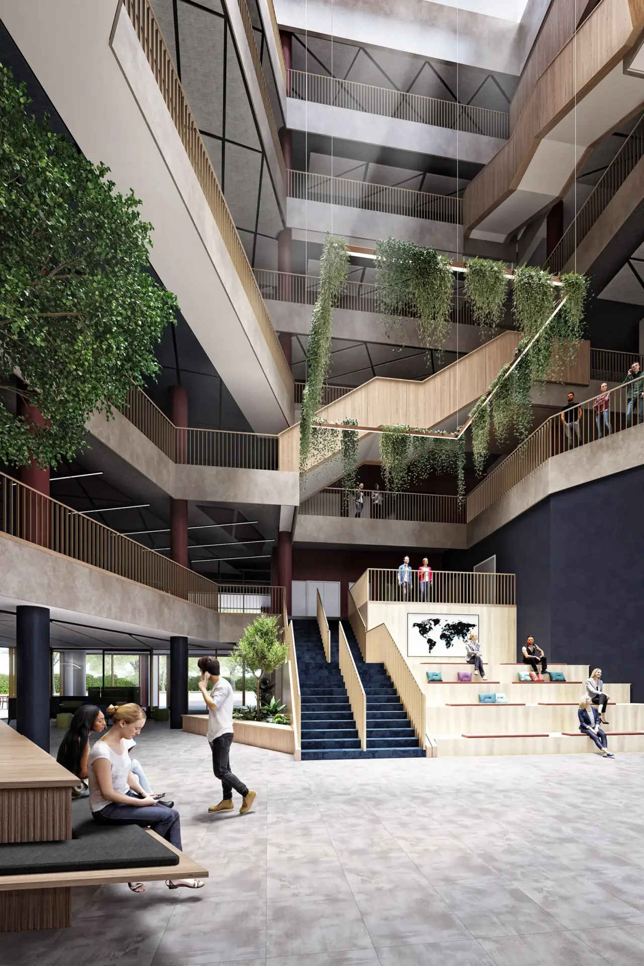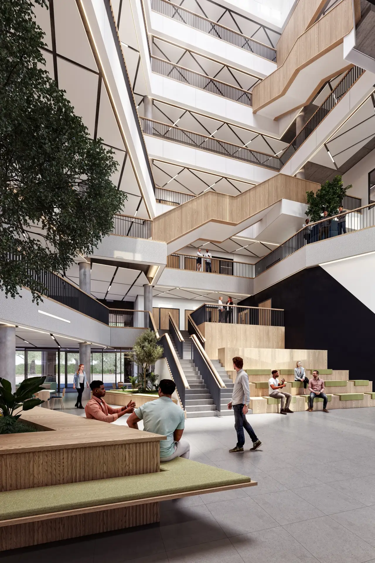 Explore a modern university campus through immersive CGI, where a bold central atrium, natural light, and integrated planting create a sophisticated, engaging environment designed to reflect academic excellence and student experience.