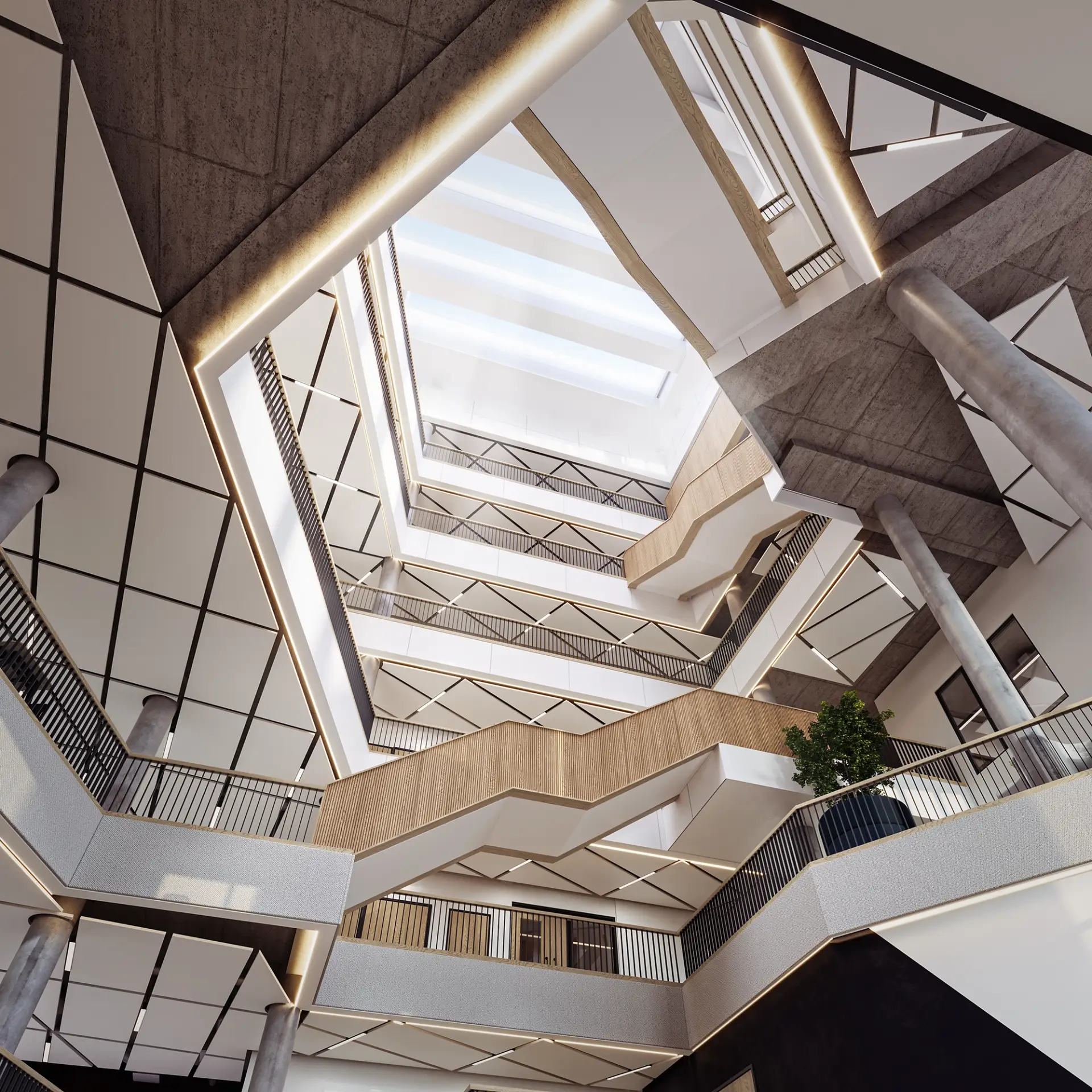 We developed a comprehensive visualisation package for a university campus centred around a large, bold atrium space. Designed as the core of the scheme, the atrium creates a strong architectural statement while acting as a hub for movement, interaction, and learning.