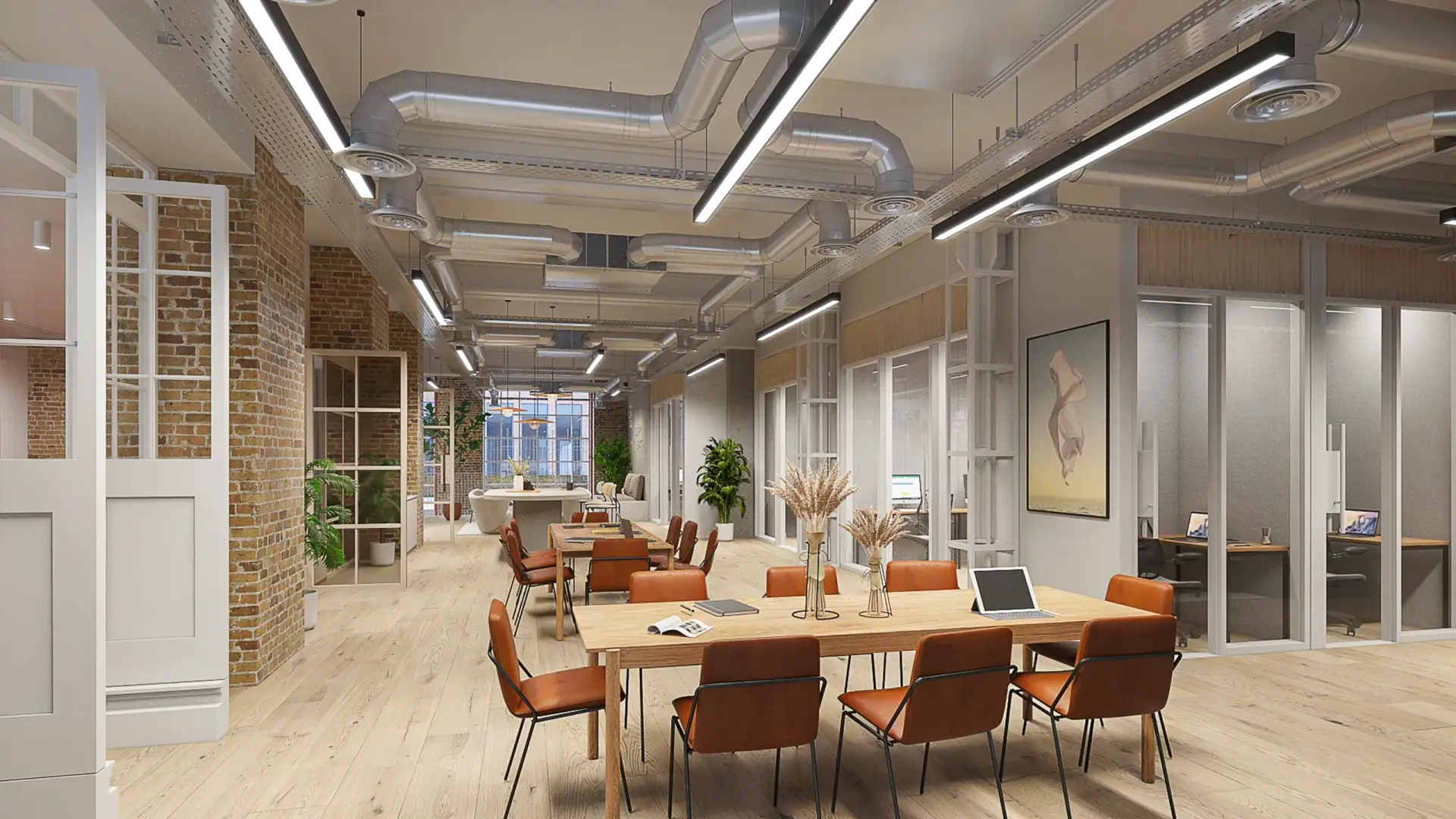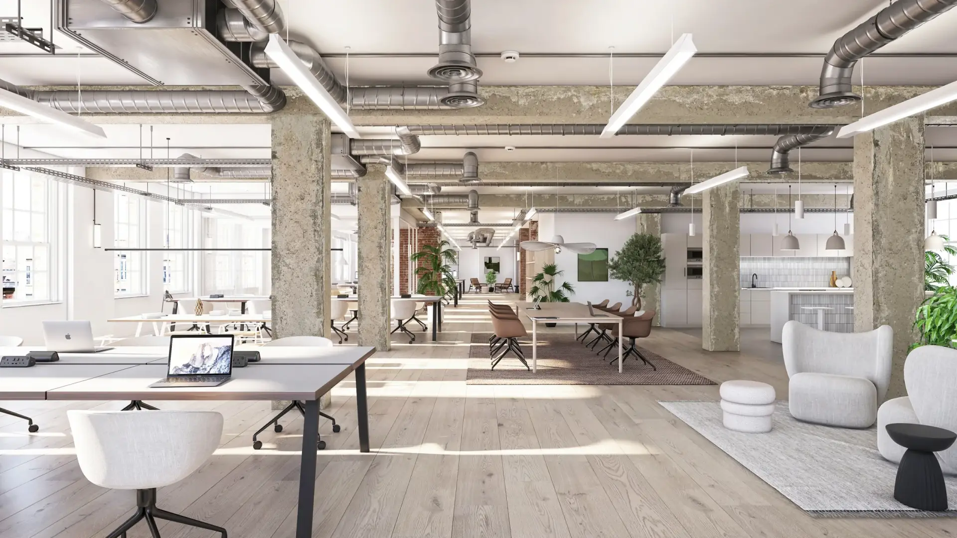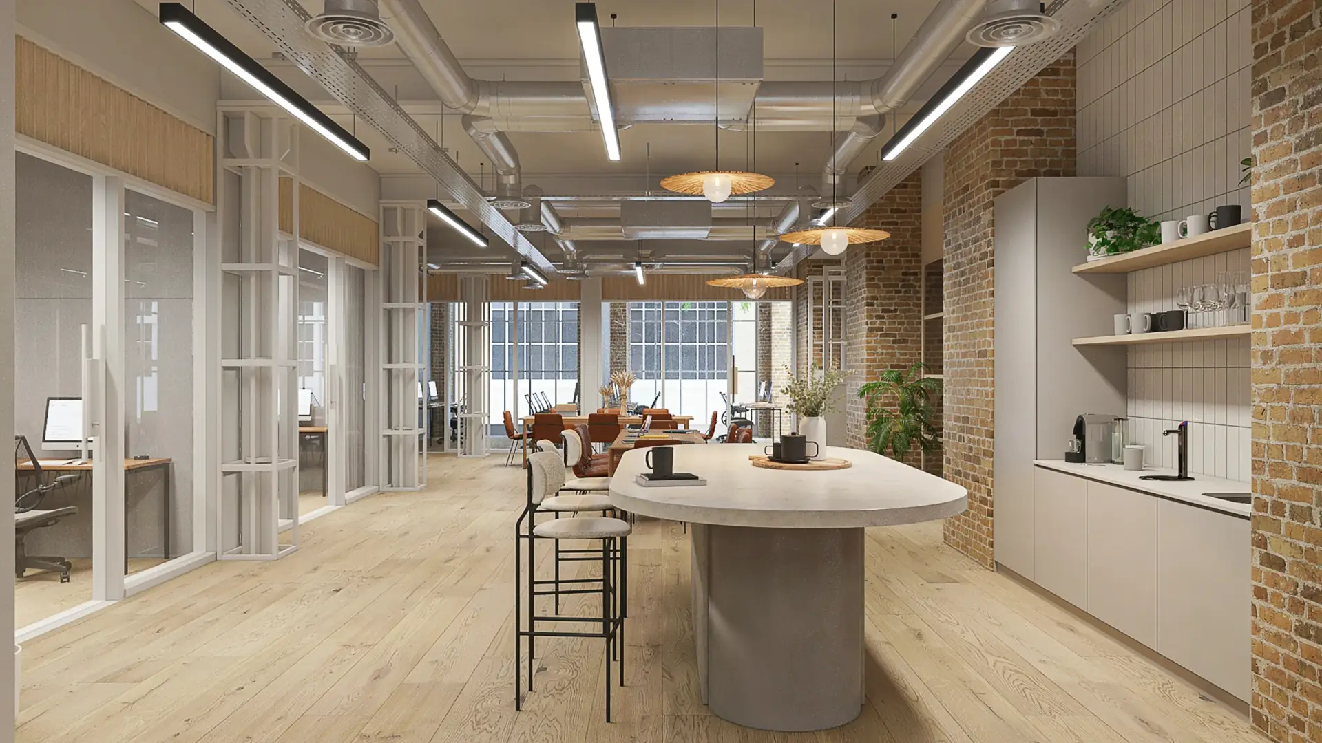Through photorealistic interior CGI and architecture-led workspace visualisation, key features such as the sculptural staircase and open-plan layout are brought to life. Natural light flows through the space, enhancing texture and depth while supporting a calm, collaborative atmosphere.