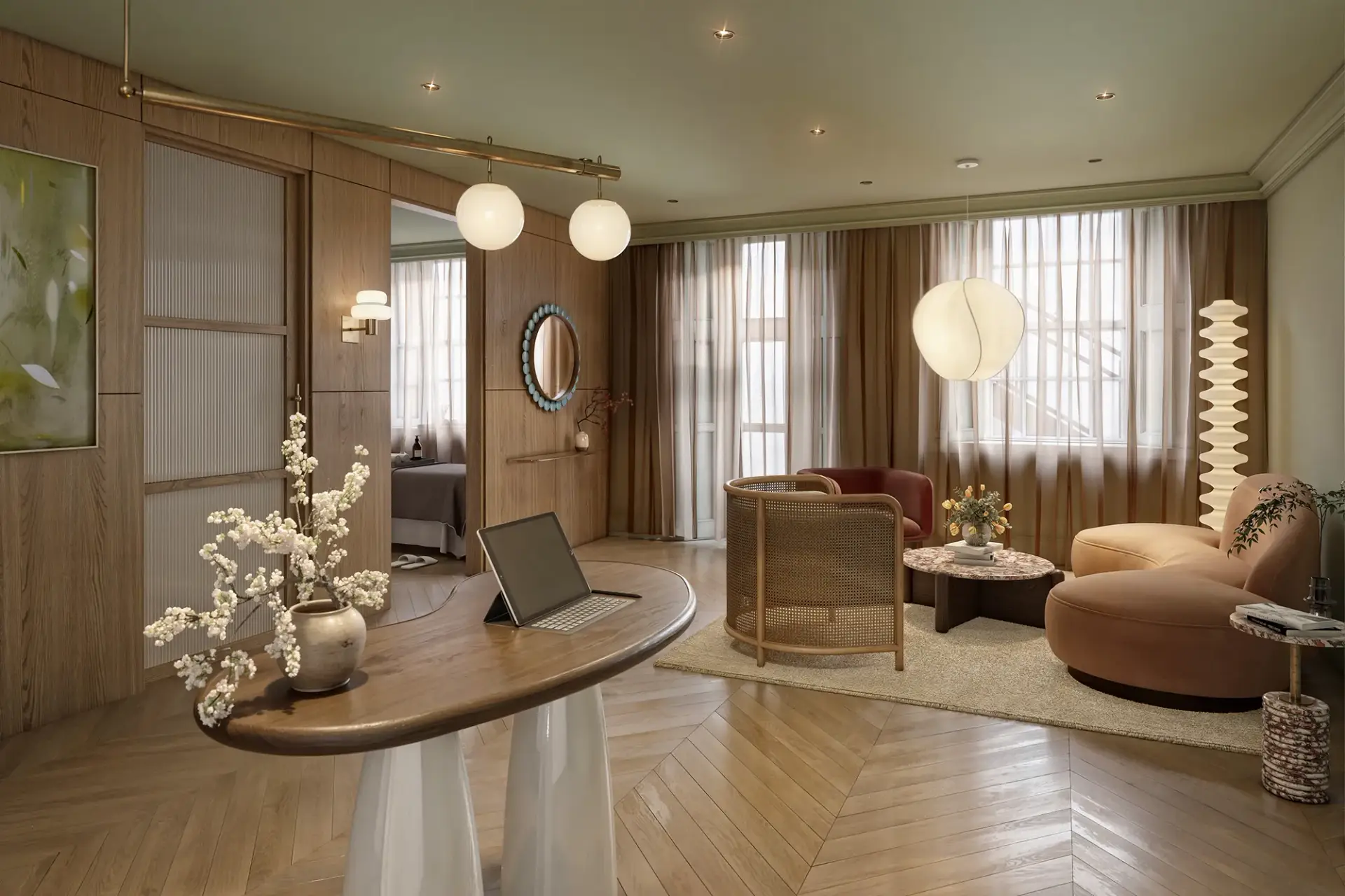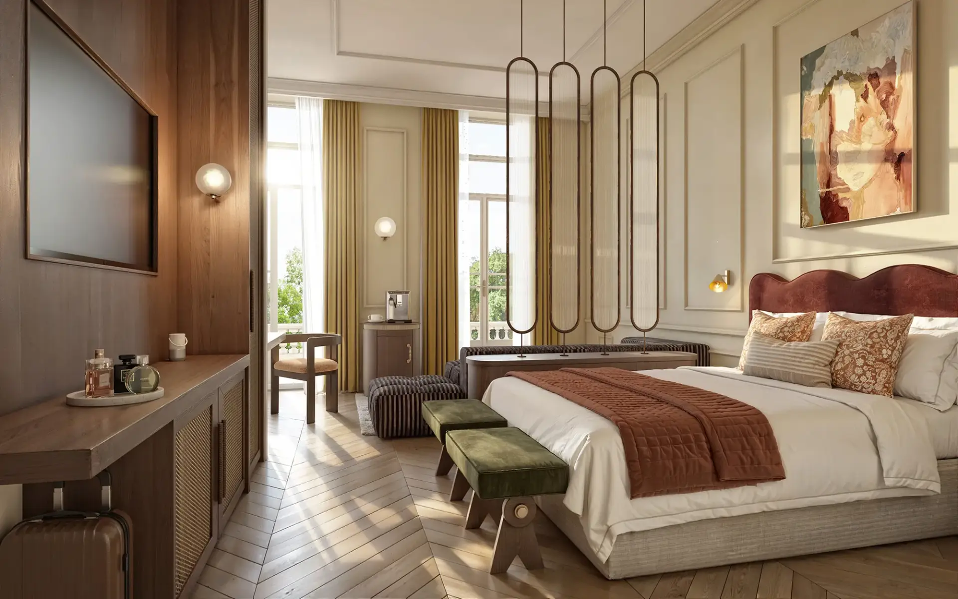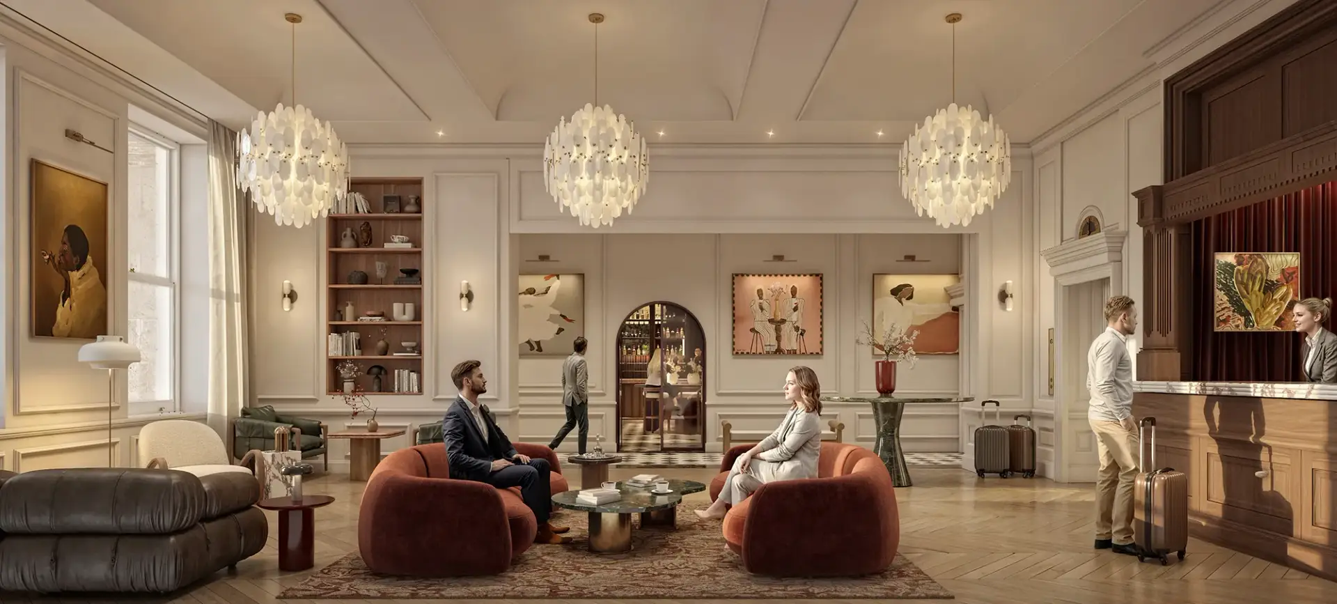 Our hospitality visualisations capture the atmosphere guests are drawn to—from refined bedrooms and social lounges to welcoming receptions and timeless façades.